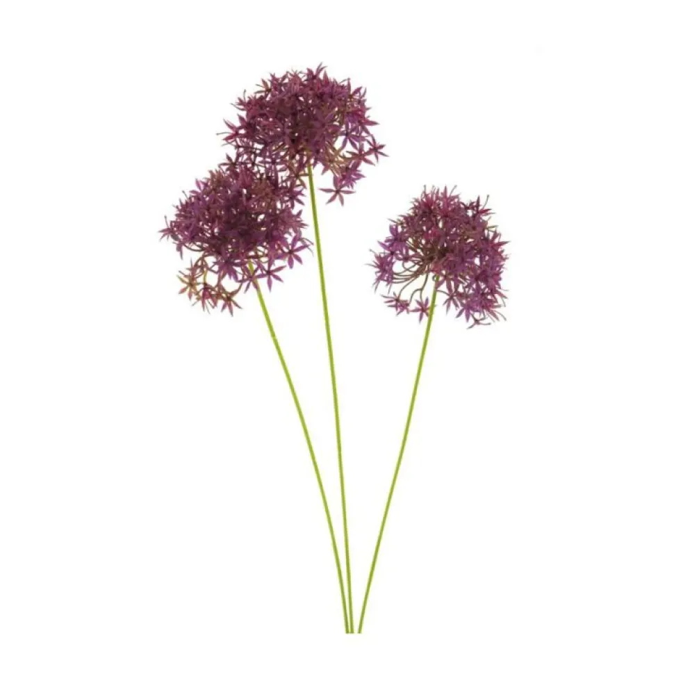 3 künstliche Alliumblüten, Blütenfarbe Fuchsia mit schmalen grünen Stängeln.