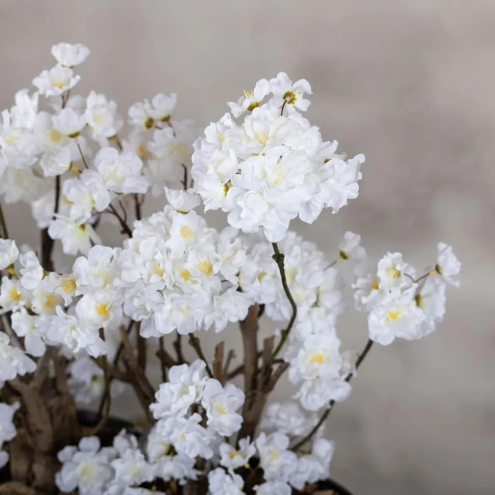 Fliederzweige mit weißen Seidenblüten in einem ovalen Übertopf, Höhe des Blütenstrauches ± 50 cm.