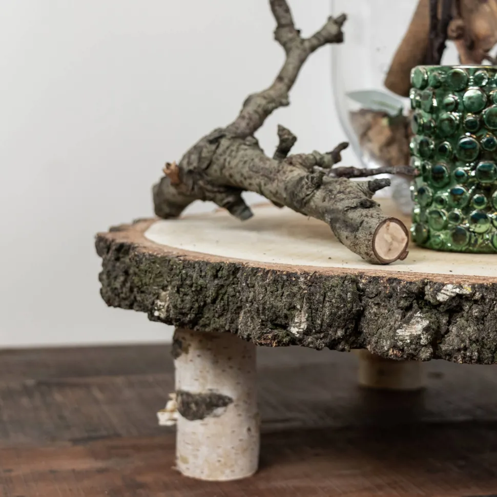 Baumscheibentisch aus Birke, für Snacks oder Deko-Artikel. Höhe 15 cm, Durchmesser ± 35-40 cm. Auch toll in Kombination mit unseren niedrigeren Baumscheibentischchen.