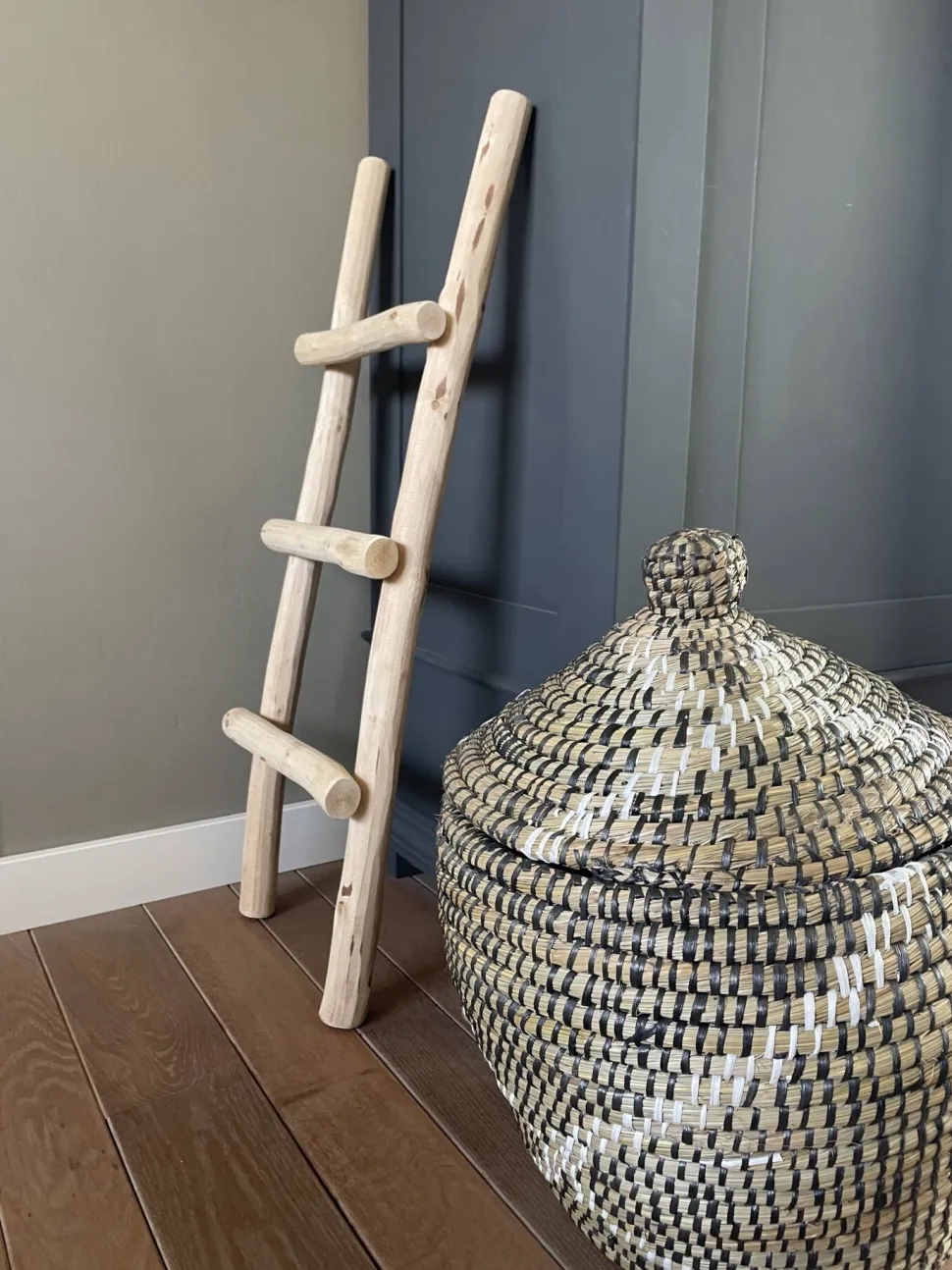 Kleine Dekoleiter aus geschliffener Holz für die Ablage von Handtüchern, Accessoires und Kleidung.