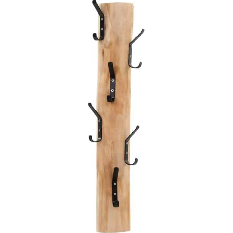 Vertikale Garderobenleiste aus einem halben Stamm mit 6 schwarzen Metallhaken, Höhe 70 cm. Zur Wandmontage.
