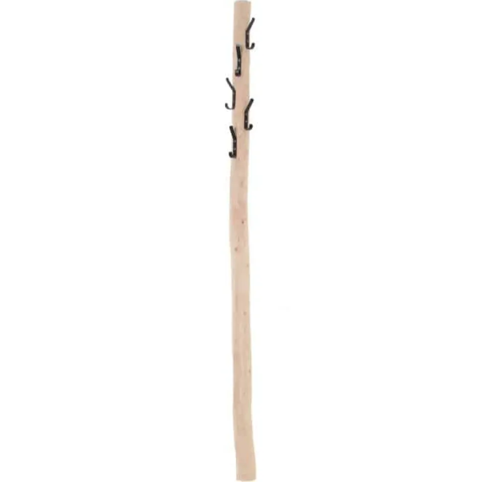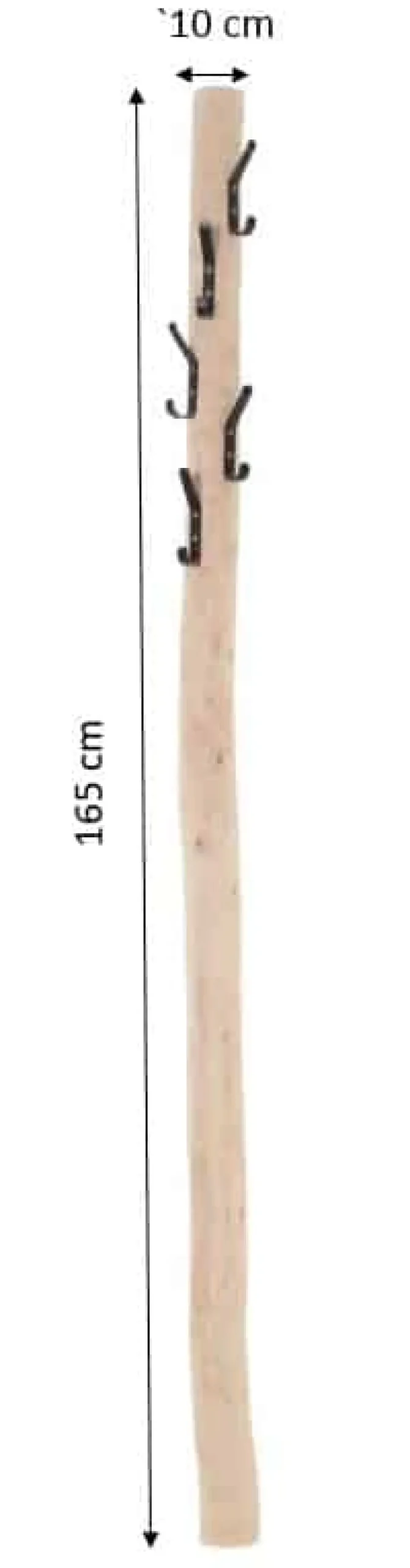 Garderobenständer zur Wandmontage aus einem halben Baumstamm, der entrindet und geschliffen wurde. Mit 6 schwarzen Metallhaken. Höhe 165 cm.