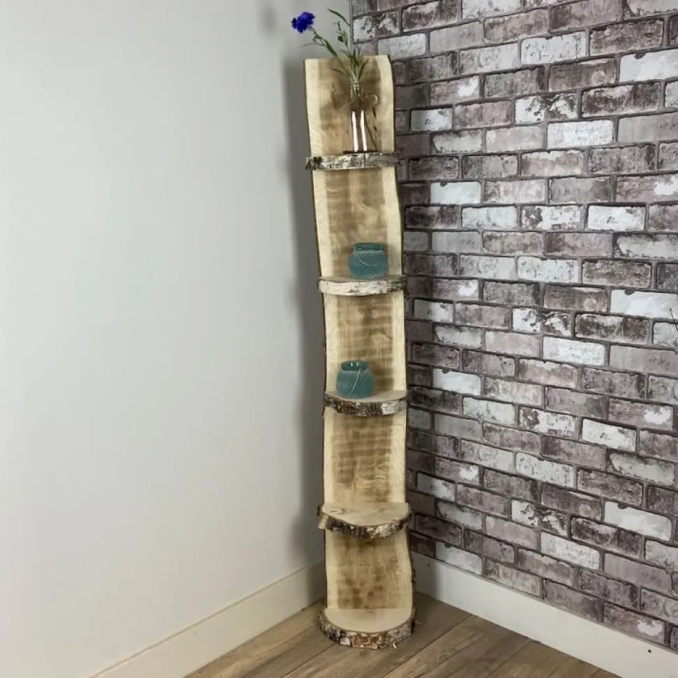 Robustes Standregal aus Eiche mit Rinde und vier Regalböden und einer Holzscheibe als Sockel.