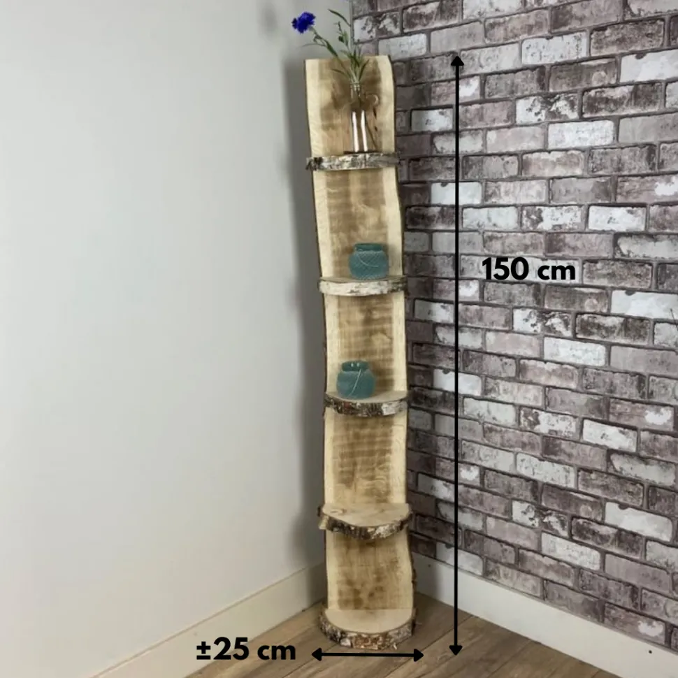 Robustes Standregal aus Eiche mit Rinde und vier Regalböden und einer Holzscheibe als Sockel. Höhe 150 cm, Breite ±25 cm.