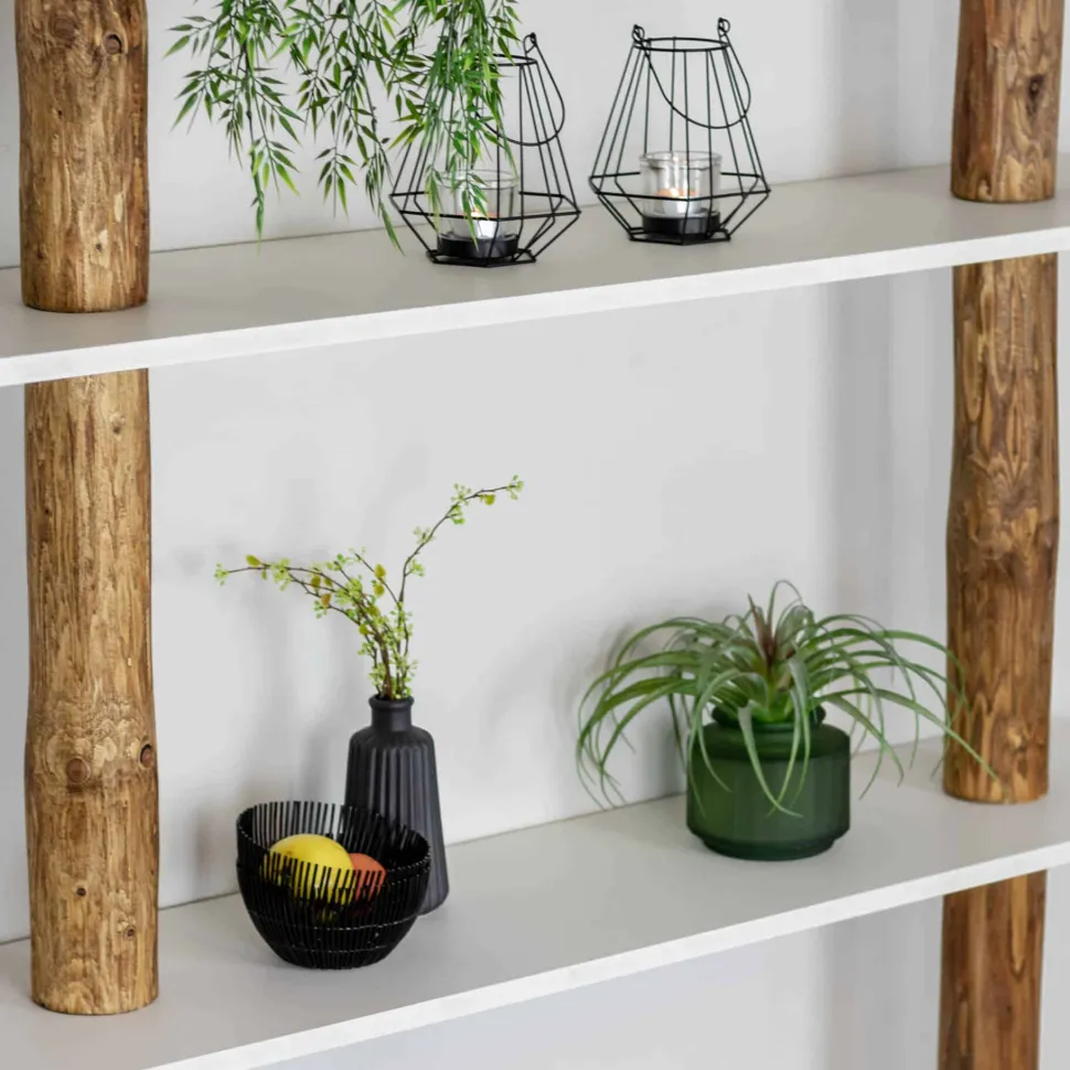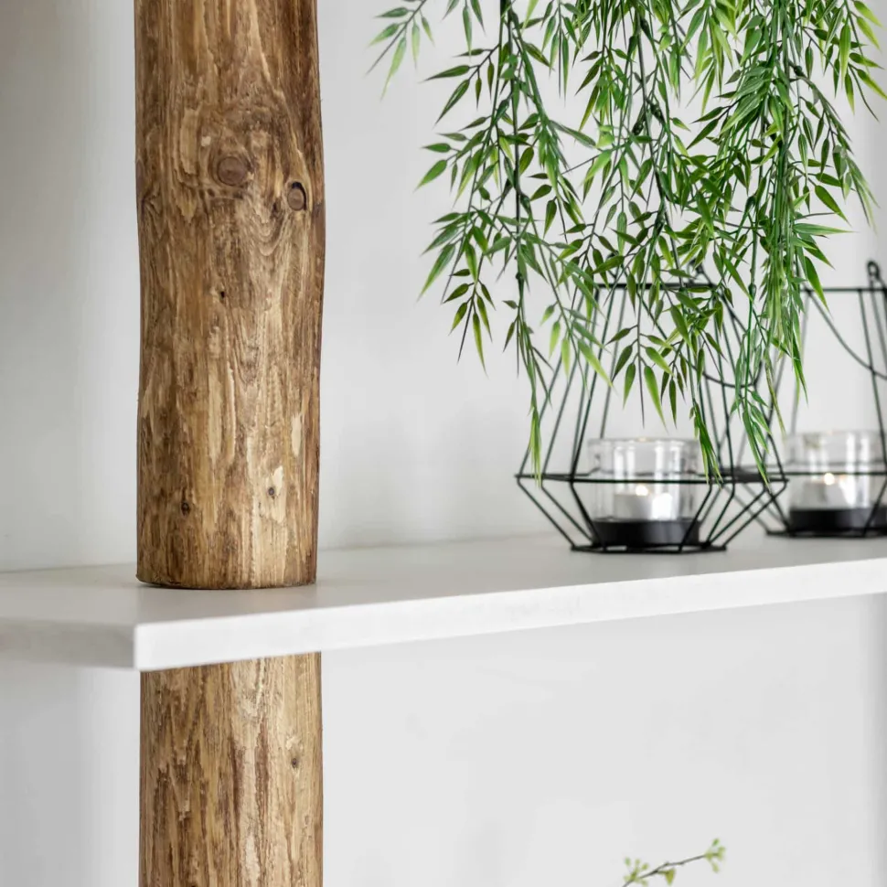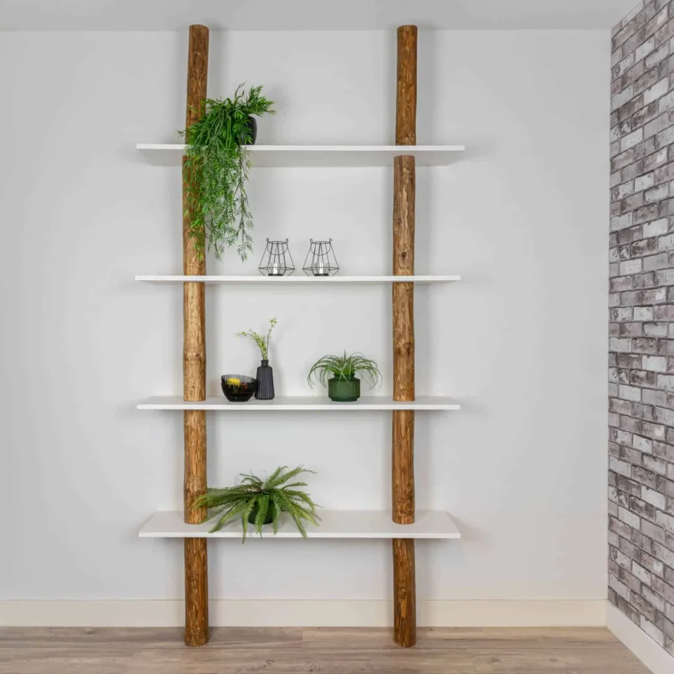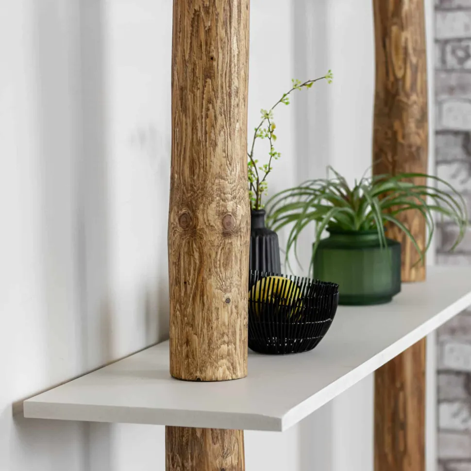 Die Baumstämme sind in einer warmen Eichenfarbe geölt. Die Regalböden sind weiß.