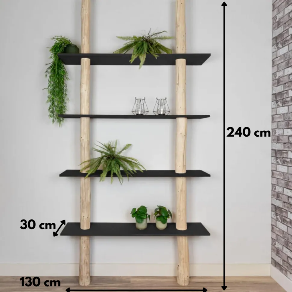 Gibt es eine freie Wand in einem Ihrer Räume und sind Sie auf der Suche nach einem besonderen Regal? Dann sollten Sie sich dieses Baumstamm-Wandregal mit schwarzen Böden ansehen. Jedes Regal ist ein handgefertigtes Unikat! Durch die beiden Baumstämme und 130 cm breiten Regalböden ist es stabil und bietet Platz für Deko-Objekte, Bücher und Pflanzen.