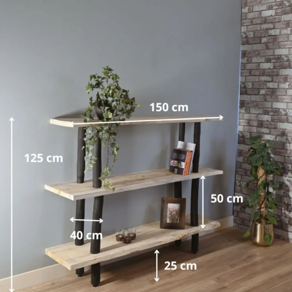 Charaktervolles Baumstammregal aus echten Baumstämmen und drei robusten Regalböden aus Eichenholz. Das Regal ist 125 cm hoch.