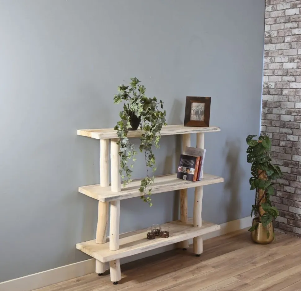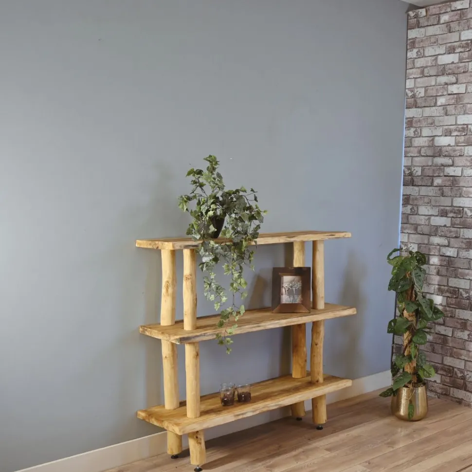Charaktervolles Baumstammregal aus echten Baumstämmen und drei robusten Regalböden aus Eichenholz. Das Regal ist 115 cm hoch.