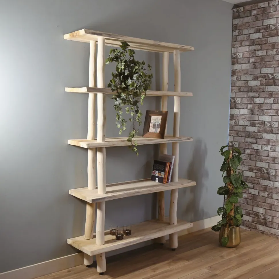 Baumstamm-Wandregal mit fünf Regalböden.