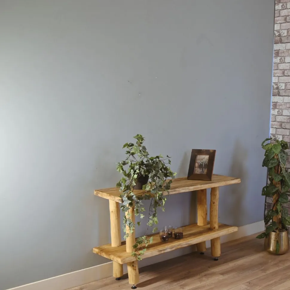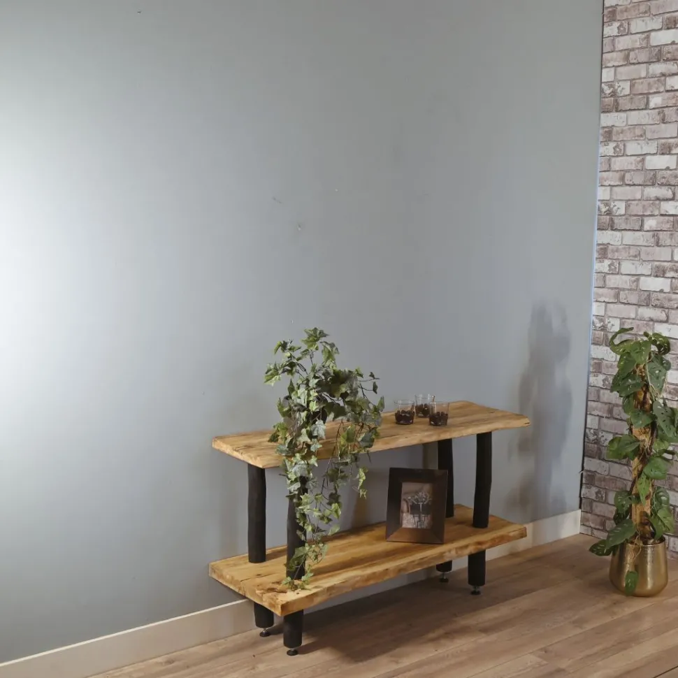 Charaktervolles Baumstammregal aus echten Baumstämmen und zwei robusten Regalböden aus Eichenholz. Das Regal ist 70 cm hoch.