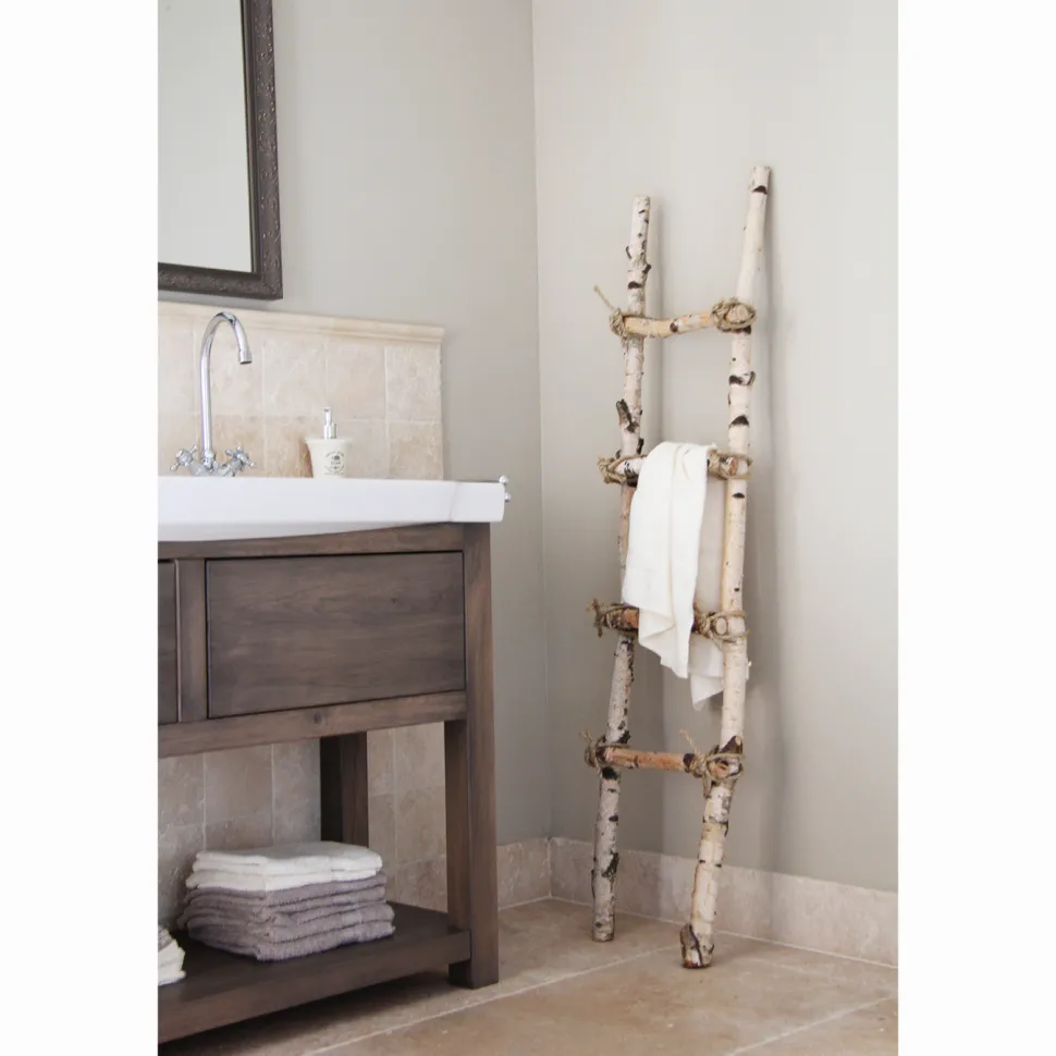 Dekorative Leiter aus Birkenholz mit vier Stufen und Juteseil. Das Seil wird lose geliefert und muss selbst an der Leiter befestigt werden.