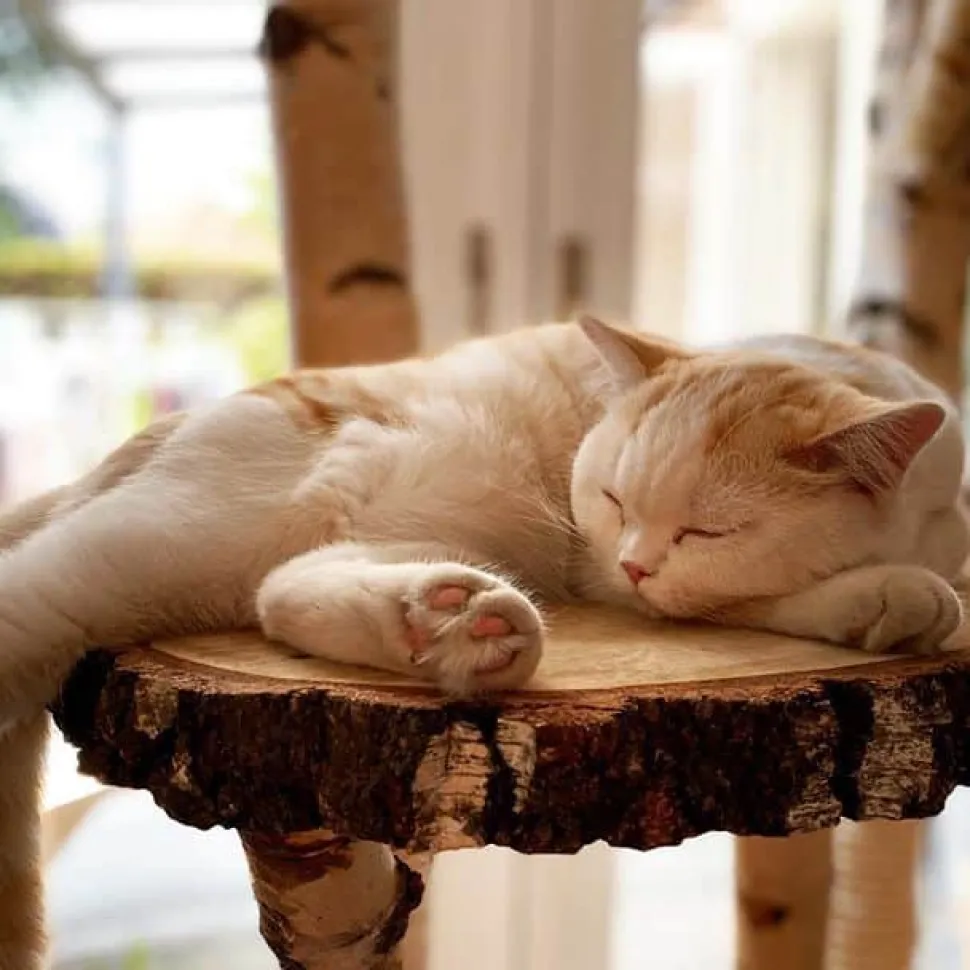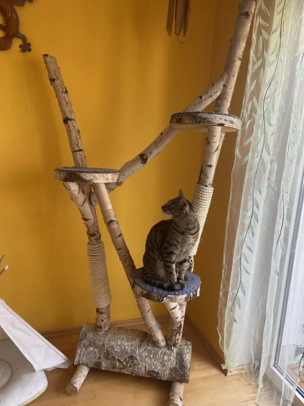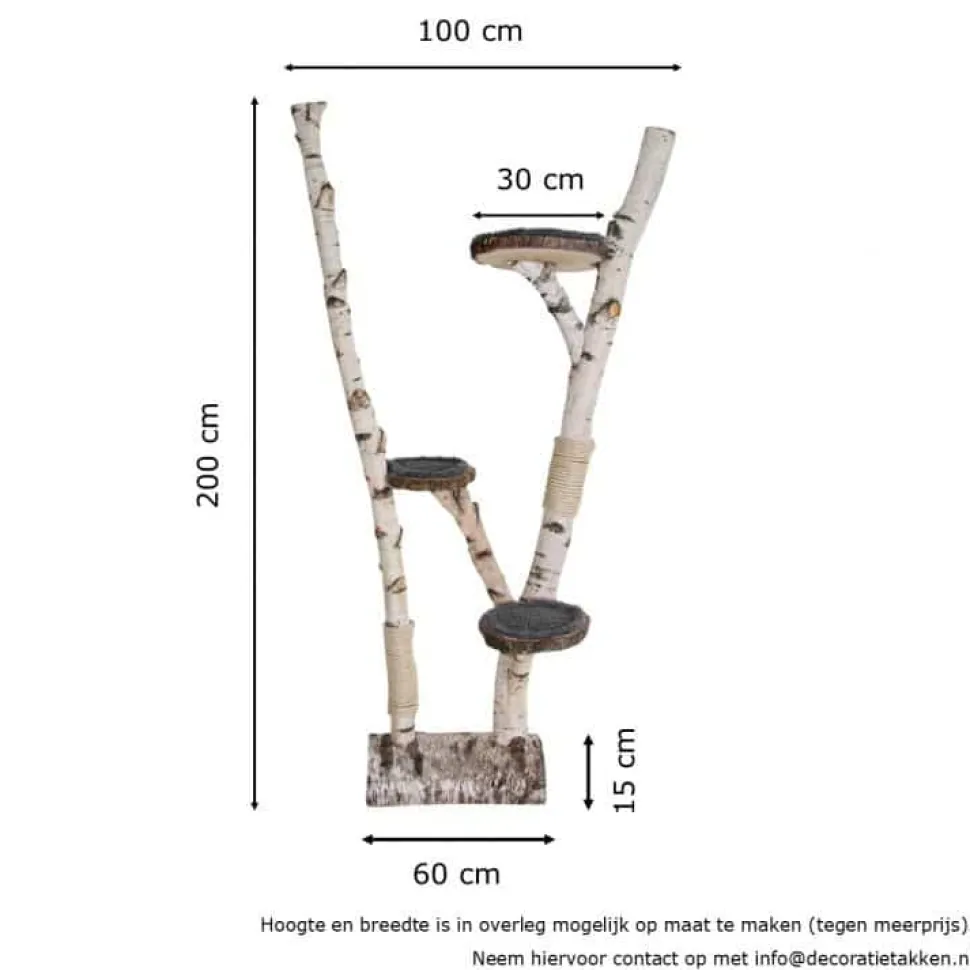 Robuster Kratzbaum aus Birkenstämmen mit einem halben Baumstamm als Fuß. Inklusive Kratzseil und drei Liegeplätzen für Ihre Katze. Weicher Stoff in drei Farben zur Auswahl, sodass Ihre Katze komfortabel liegen kann. Höhe 200 cm, Breite 100 cm.