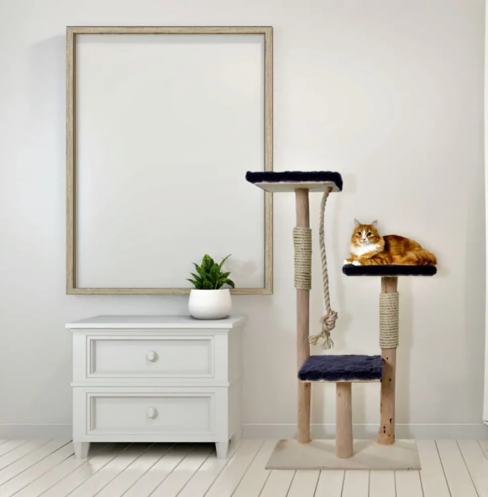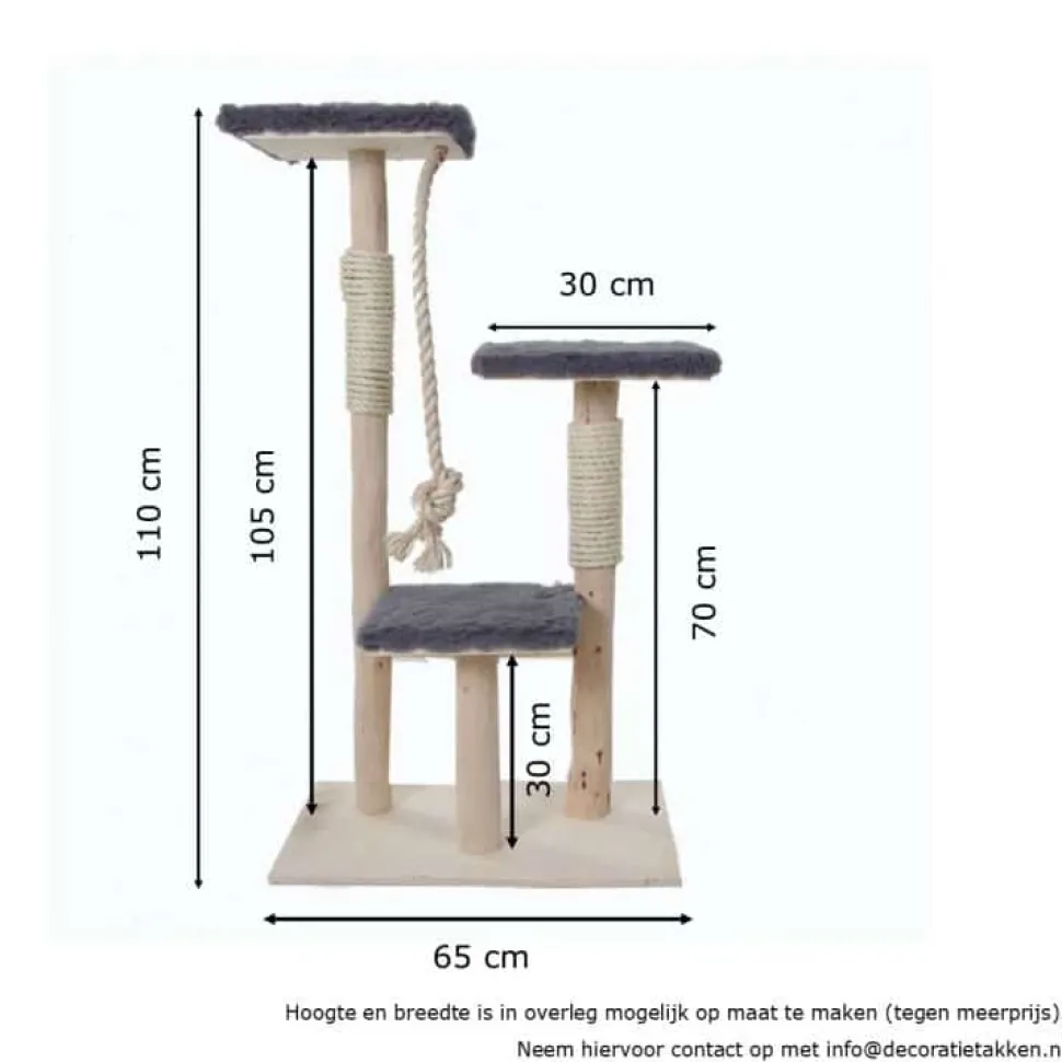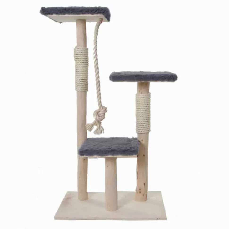 Kratzbaum aus geschliffenen Birkenstämmen mit drei quadratischen Liegeplätzen und quadratischem Fuß. Inklusive Kratzseil und Spielseil. Weicher Stoff in drei Farben zur Auswahl, sodass Ihre Katze komfortabel liegen kann. Höhe 110 cm, Breite 65 cm.