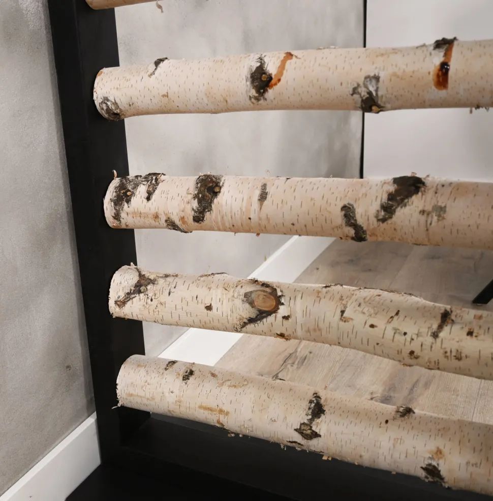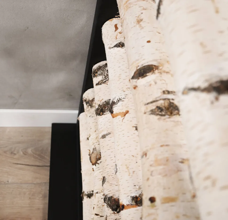Raumteiler mit horizontalen Birkenstämmen mit schwarzem Sockel. Ideal, um Ihren Raum auf spielerische Weise zu unterteilen. Höhe 165 cm, erhältlich in den Breiten 60 und 100 cm.