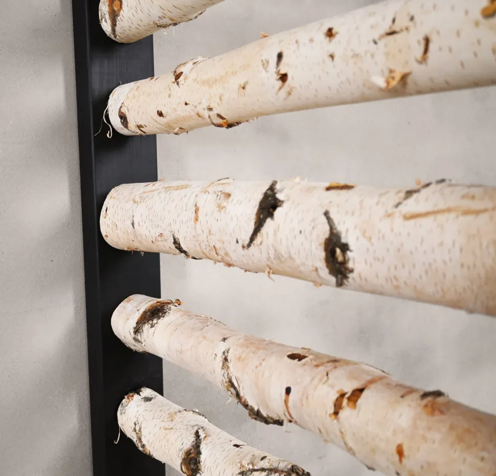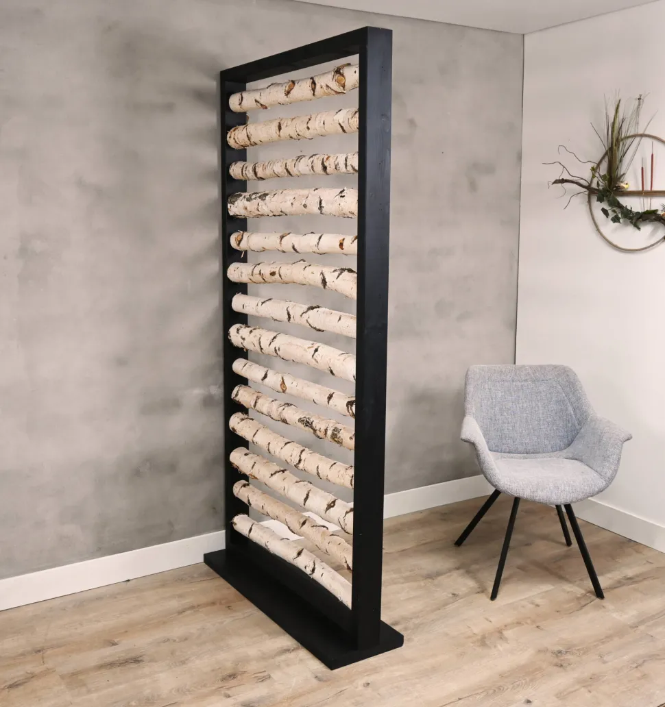 Raumteiler mit horizontalen Birkenstämmen mit schwarzem Sockel. Ideal, um Ihren Raum auf spielerische Weise zu unterteilen. Höhe 200 cm, erhältlich in den Breiten 60 und 100 cm.