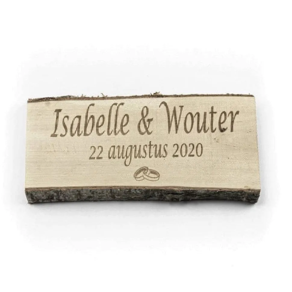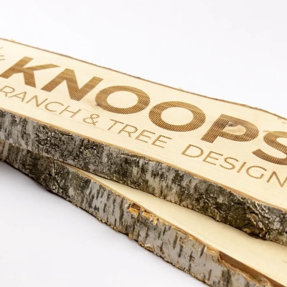 Personalisierte Birkenholzplanke, Länge ± 50 cm mit eigenem Text und Logo.