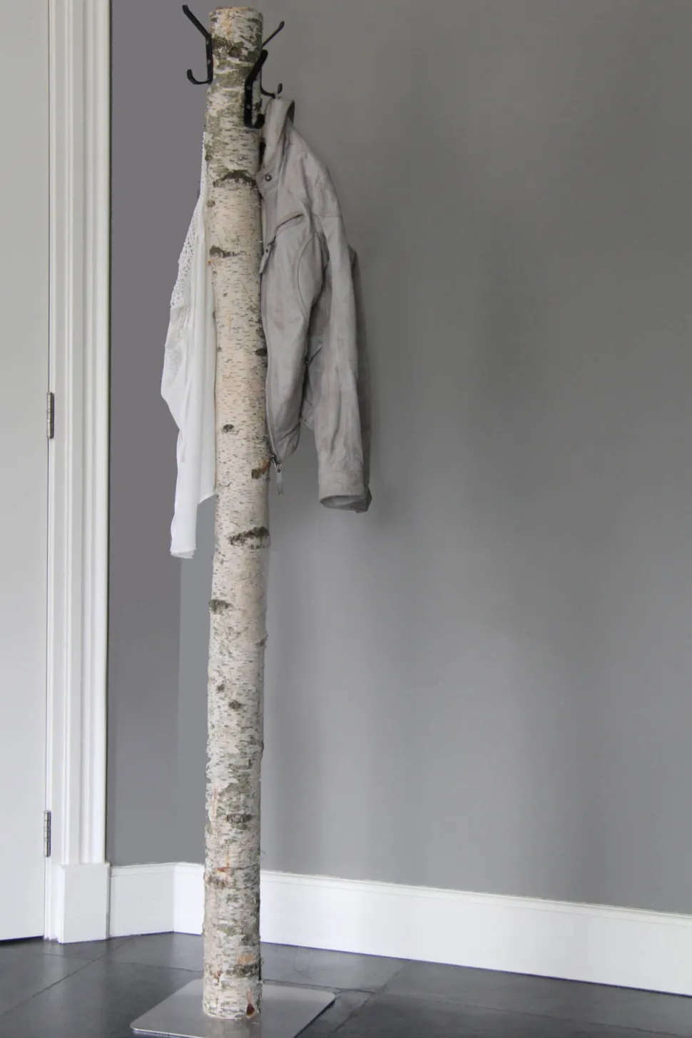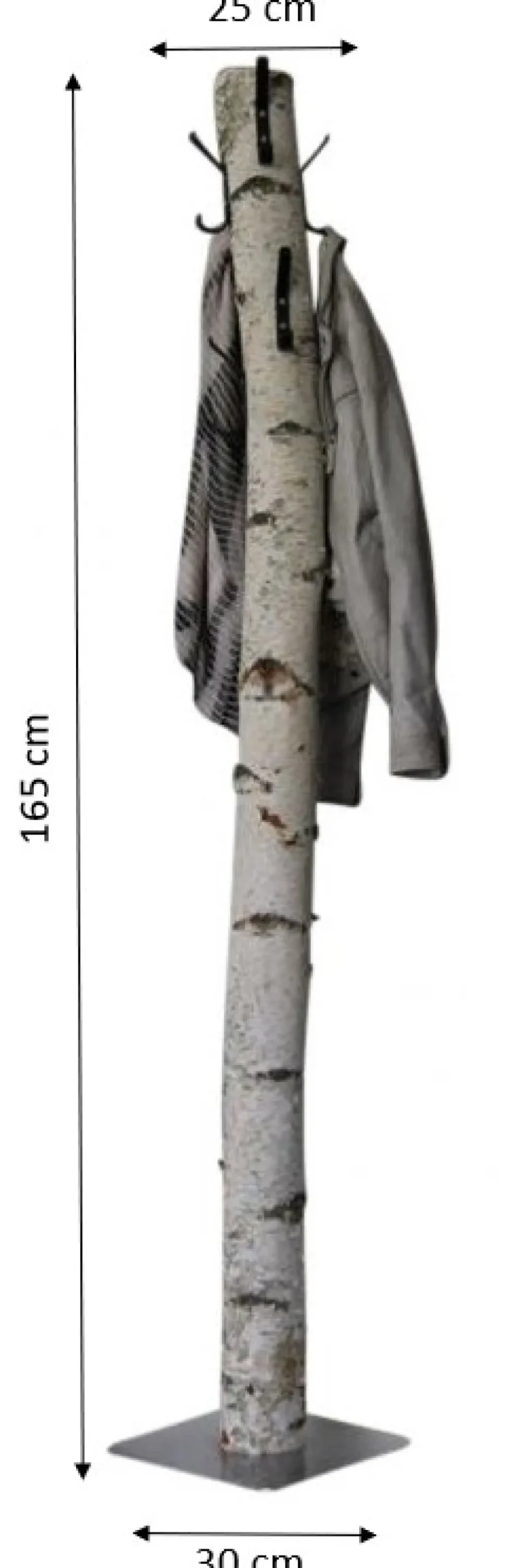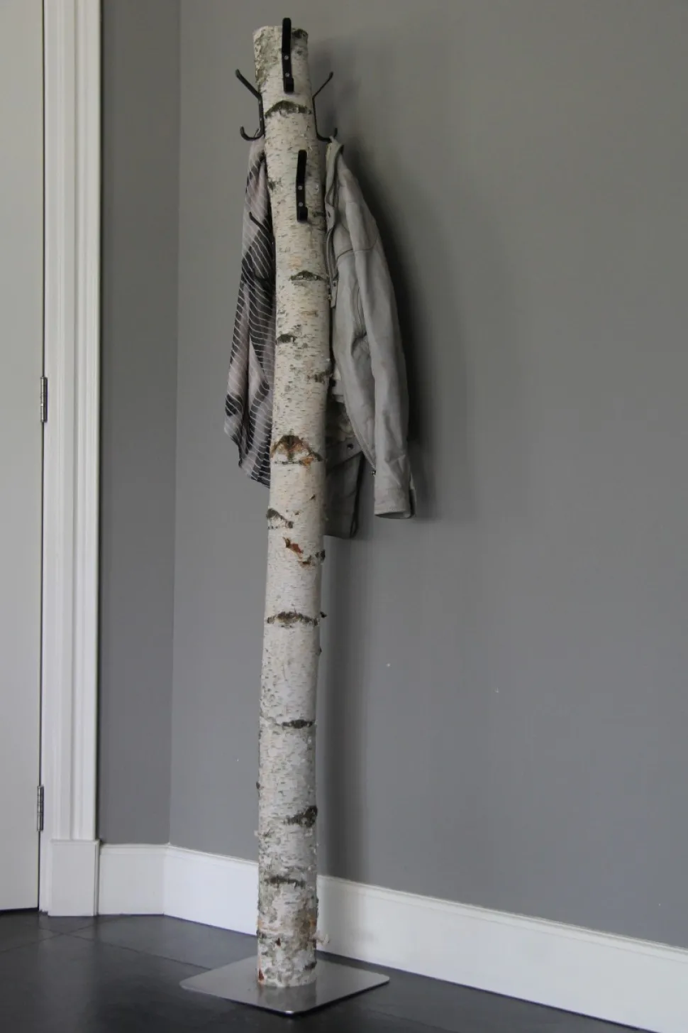 Garderobenständer aus einem Birkenstamm mit acht schwarzen Metallhaken. Höhe 165 cm. Wird standardmäßig mit einem runden Holzfuß geliefert (die Abbildung zeigt einen Edelstahlfuß).