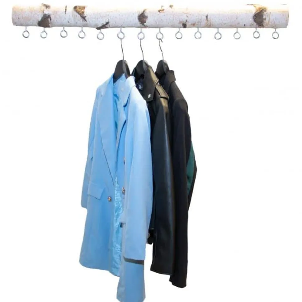 Originelle Hängegarderobe aus einem Birkenstamm, mit 14 silbernen Ösen zum Aufhängen der Kleiderbügel.