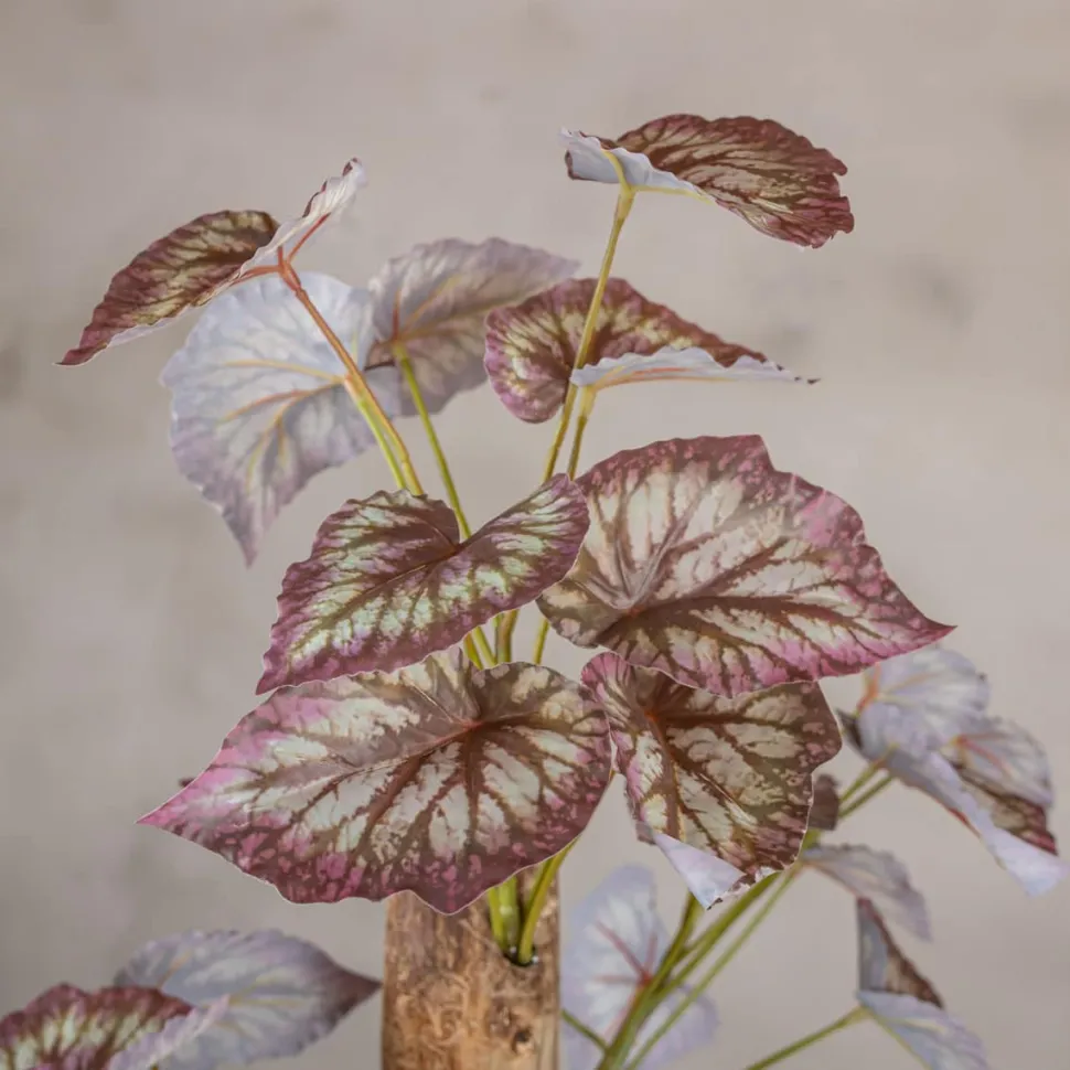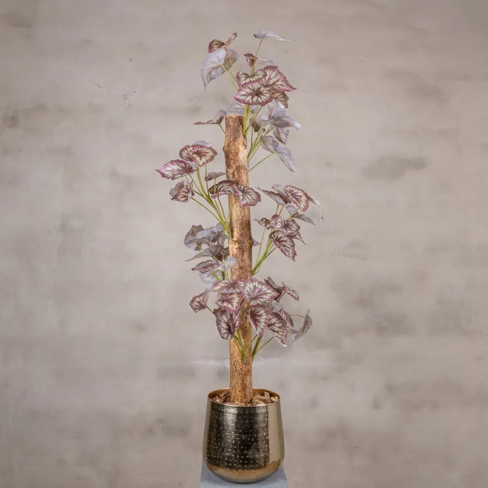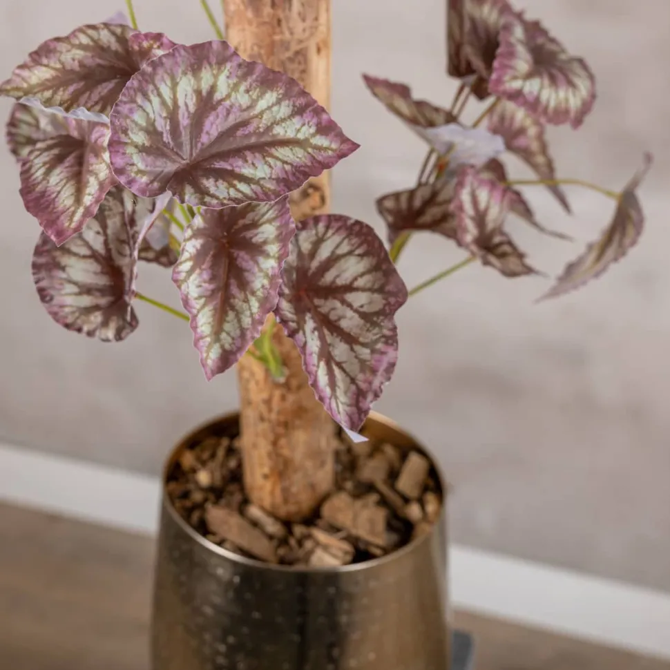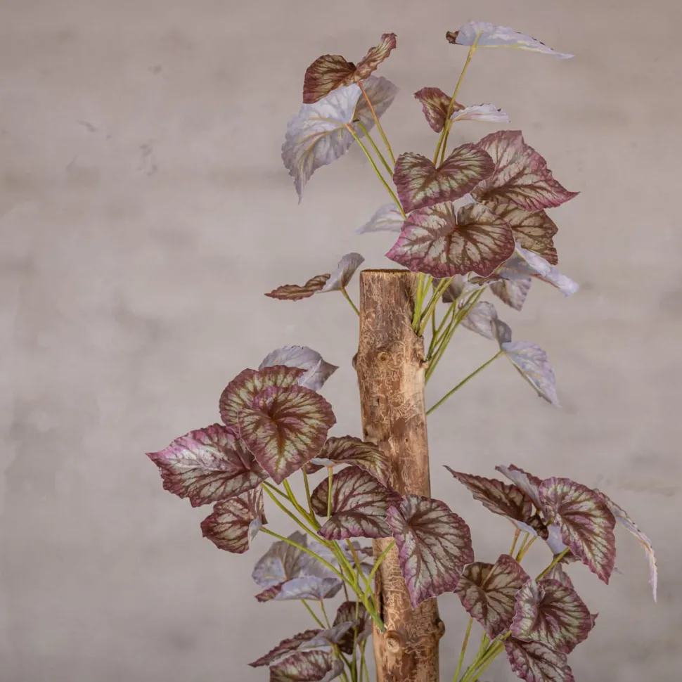Natürlicher Stamm mit Kunstblatt-Begonienzweigen in rot/grüner Farbe mit einem Innentopf von 15 x 19 cm.