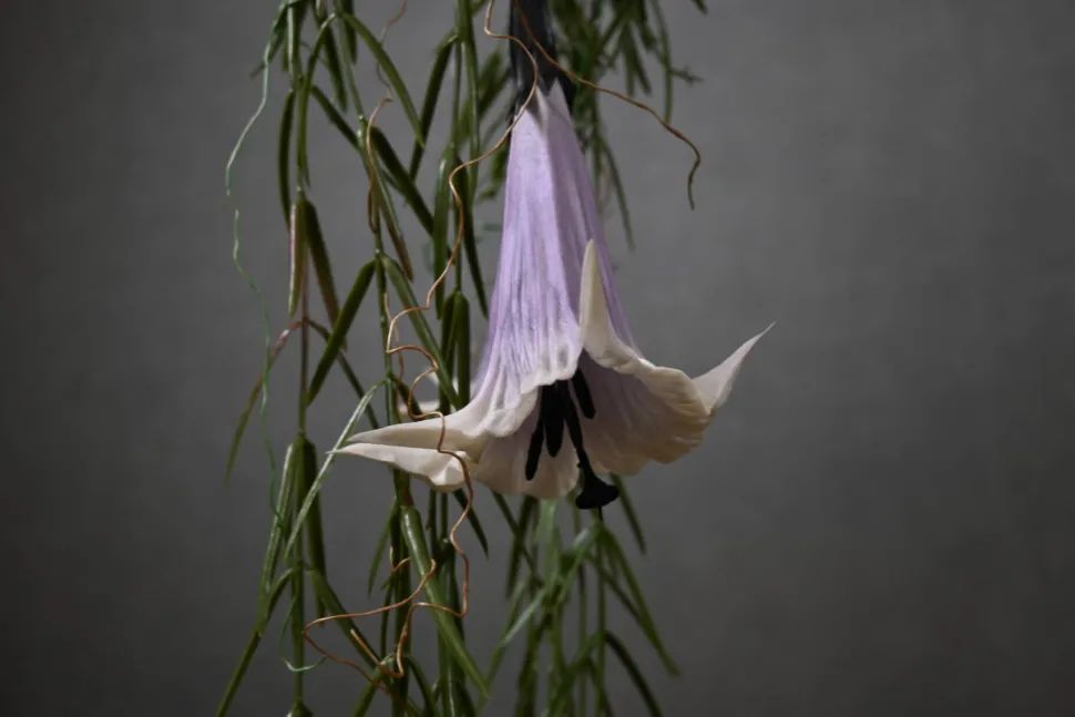 Robuster, urwüchsiger, entrindeter Stamm mit Dekoration aus grünen Kunstpflanzen und fliederfarbenen Seidenblumen, inkl. Jute-Aufhängeseil.