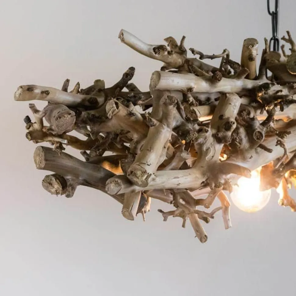 Hängeleuchte aus dekorativen, entrindeten Birnenästen. Die Holzleuchte (150 cm) hängt an zwei schwarzen Ketten (70 cm). Die Ketten sind an einer Deckenbefestigung verankert. Drei Lampenfassungen wurden in die Äste integriert. Lieferung exklusive Glühbirnen.