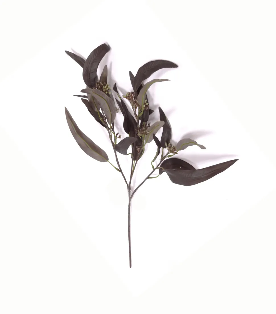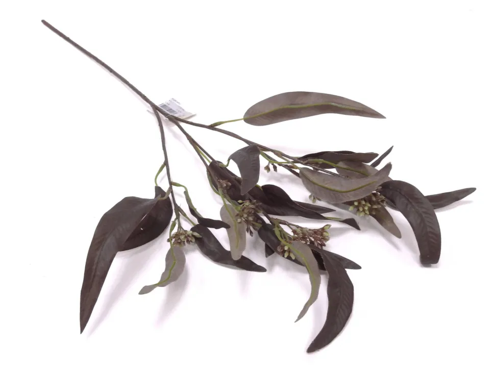 Eukalyptuszweig mit mehreren Verzweigungen und schmalen auberginefarbenen Blättern.