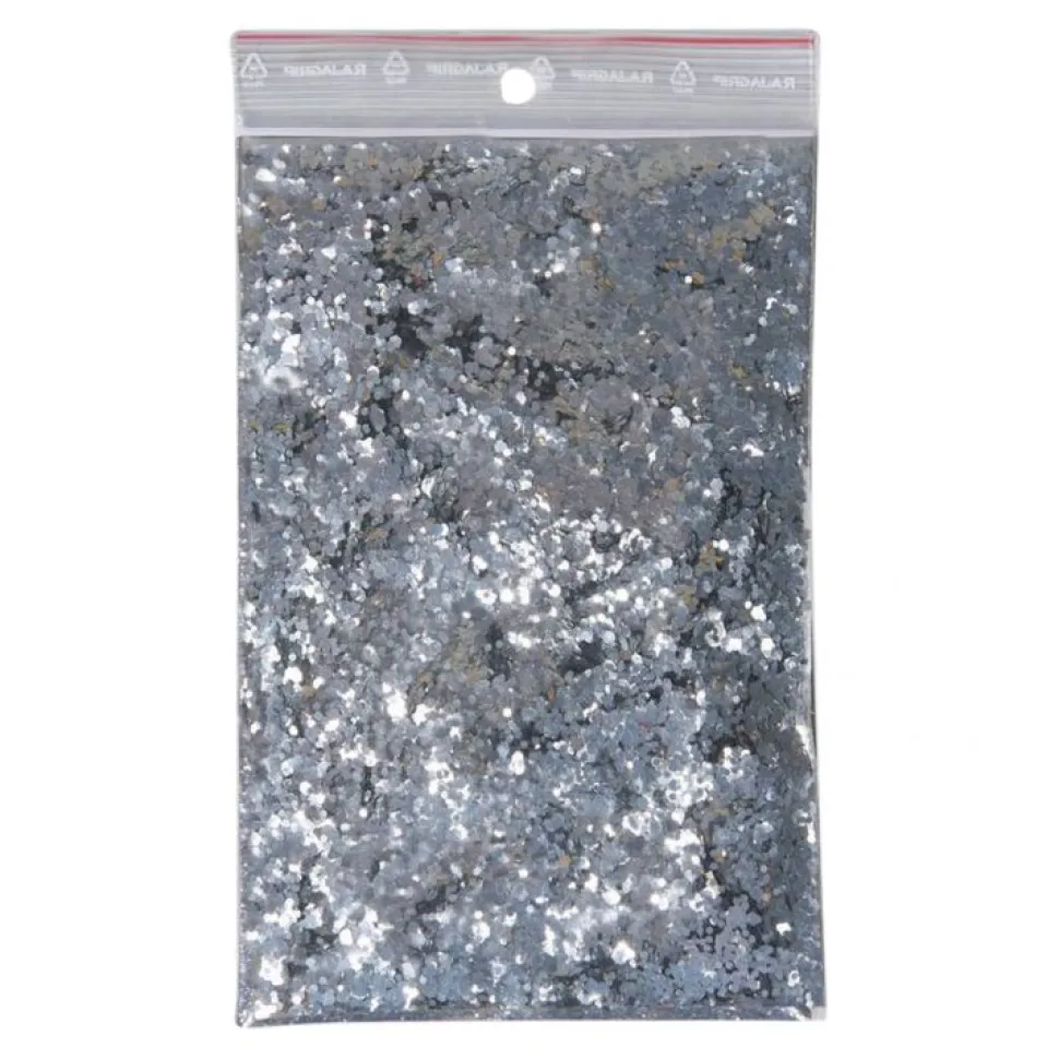Silberfarbener Glitter, grobkörnig. Beutelinhalt 200 ml. Glittergröße ± 3 mm.