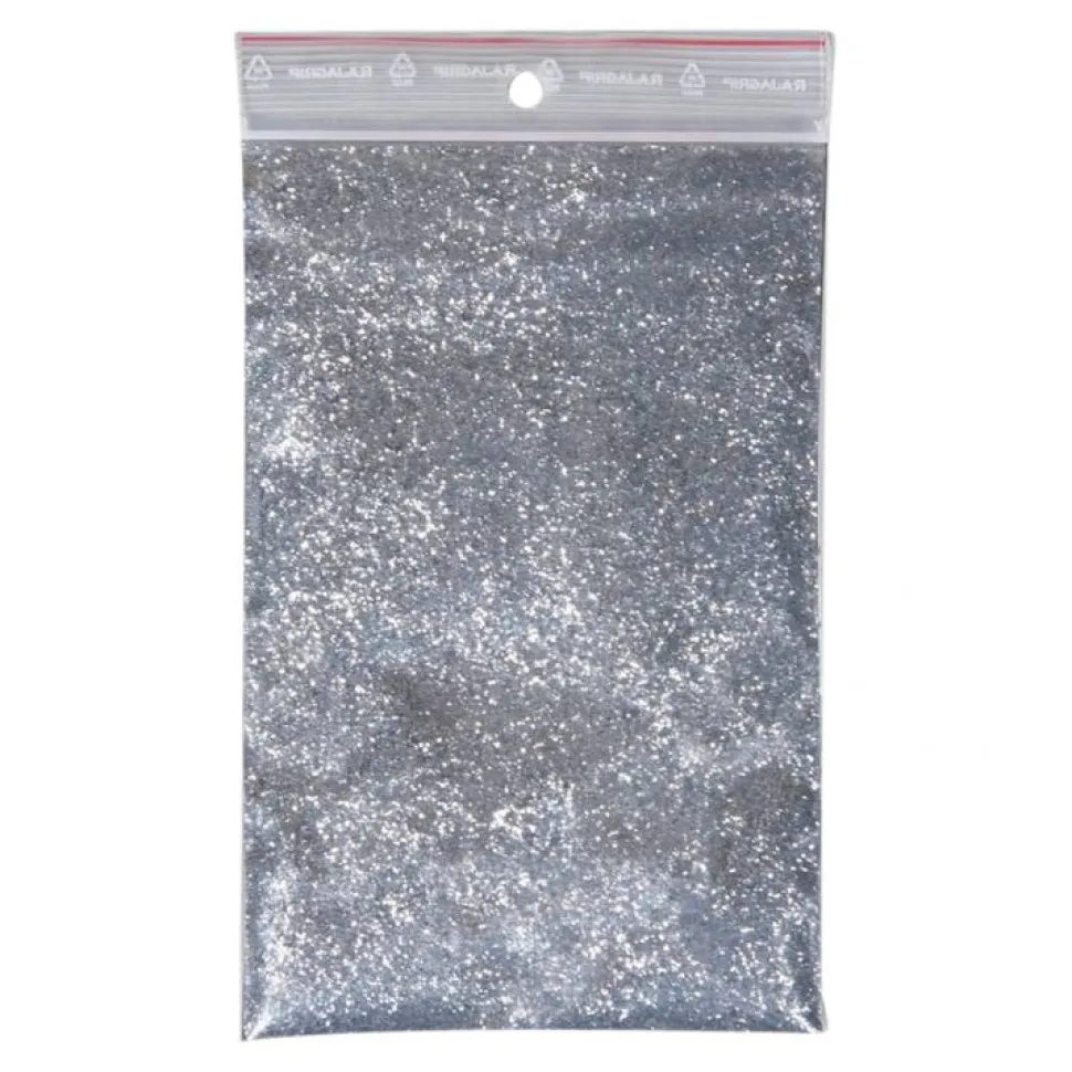 Glitzer in Silber mit feiner Körnung. Beutelinhalt 200 ml. Glittergröße ± 0,06 mm.