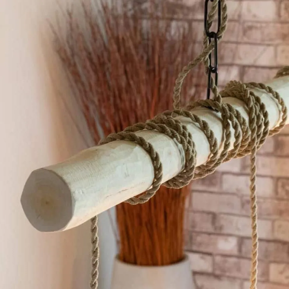 Entrindetes Aststück (120 cm lang) mit Aufhängung aus Naturtau (70 cm lang). Die Seile sind an einer schwarzen Deckenbefestigung verankert.