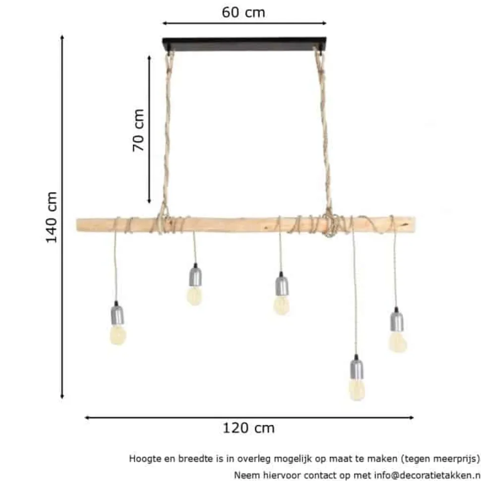 Hängende Lampe mit entrindetem Baumstammstück und 5 Lampenfassungen auf Textilkabel. Breite 120 cm.