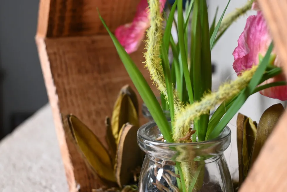 Holz-Hexagon mit rosa künstlichen Anemonen im Glas. Höhe 25 cm.