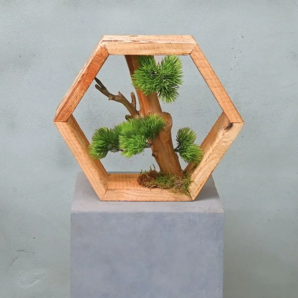 Holz-Hexagon mit Eichenzweig und künstlichen Bonsai-Ästen.