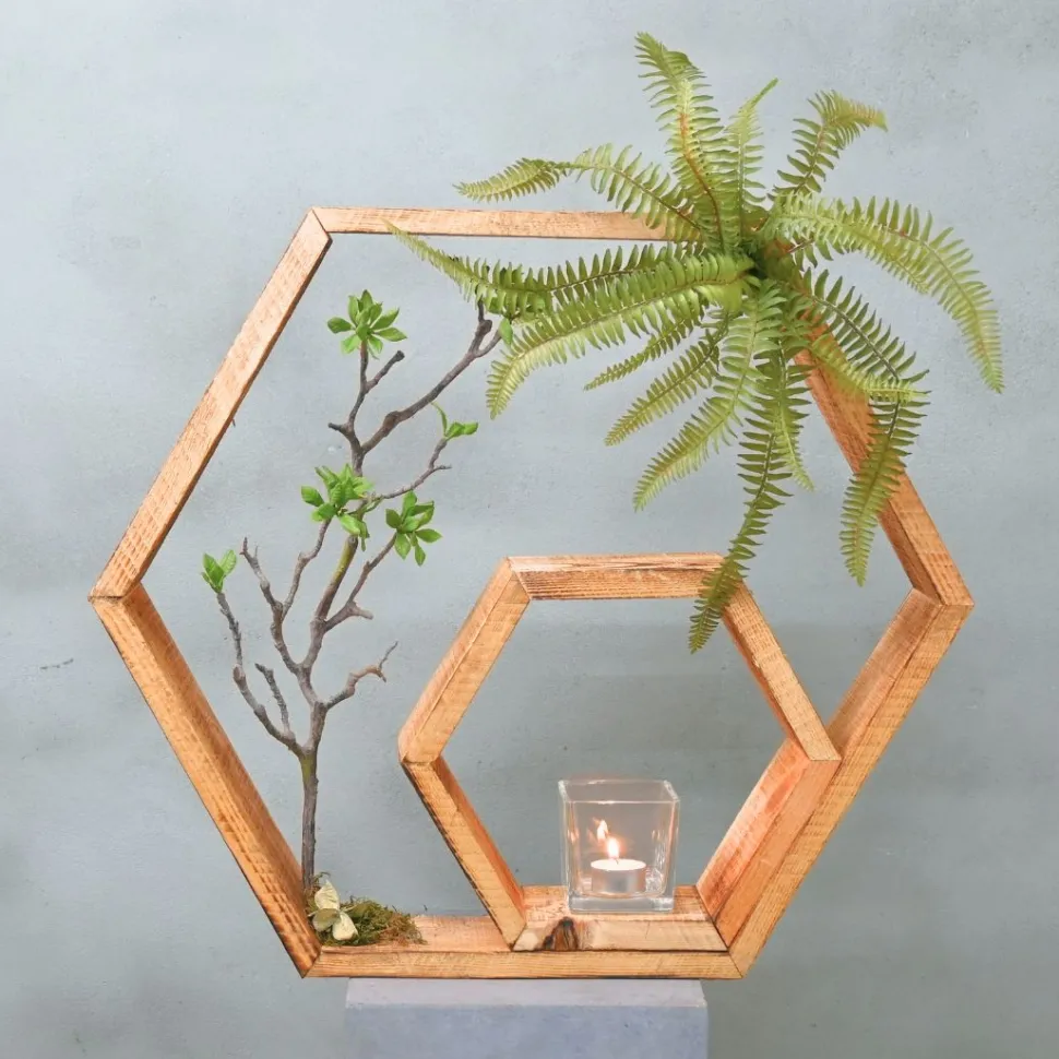 Holz-Hexagon mit verschiedenen Kunstpflanzen und Teelicht.