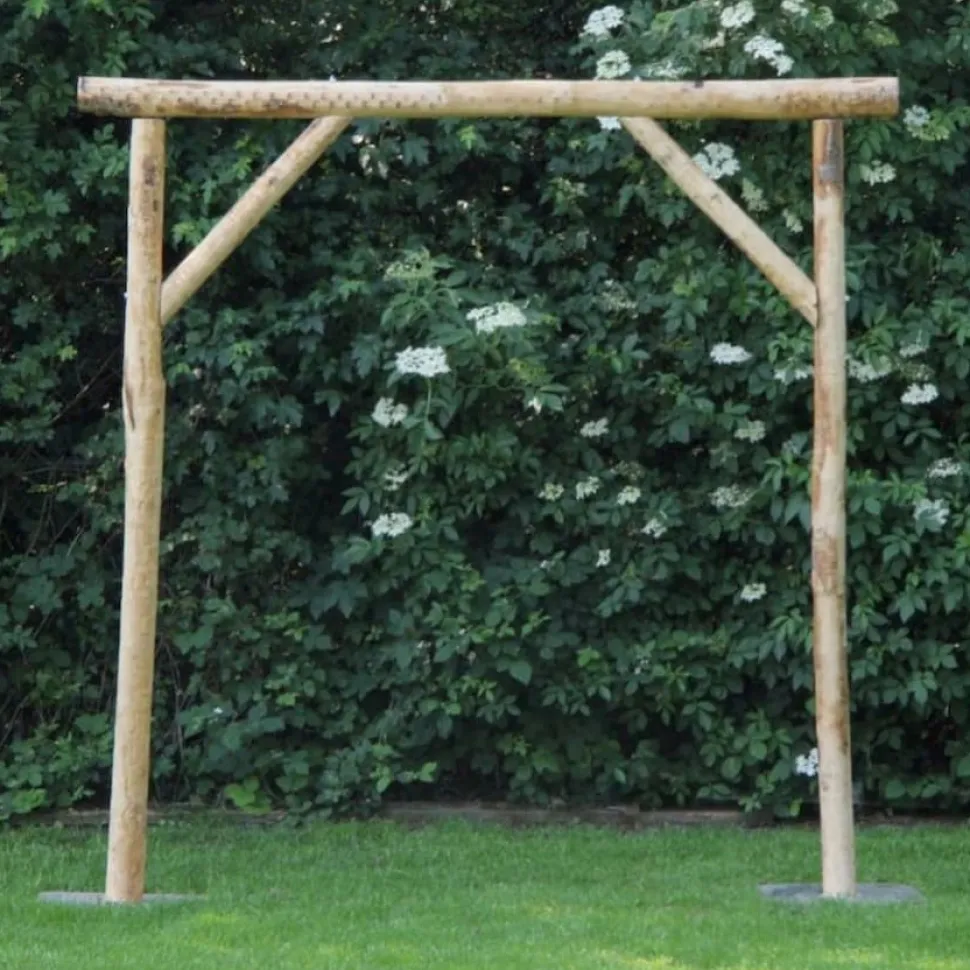 Dieser rustikale Bogen aus entrindeten Baumstämme wird in Einzelteilen angeliefert und ist einfach aufzubauen. Nach der Nutzung ist er leicht zu demontieren.