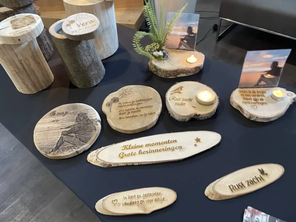 Holzscheibe mit Aussparung für ein Foto und ein Teelicht oder eine Kerze, Durchmesser ±20 cm.