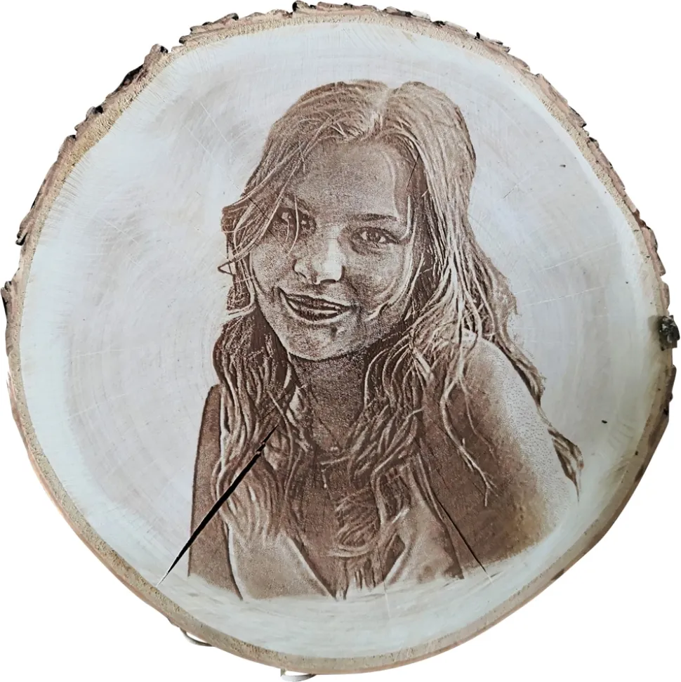 Personalisierte Holzscheibe ± 20-25 cm mit eigenem Foto / Logo und Text.