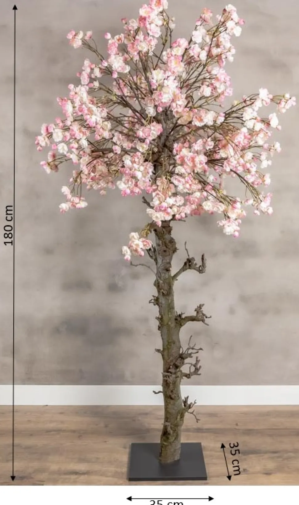 Baum mit natürlichem Stamm und japanischen rosa Kunstblüten auf einem schwarzen Holzsockel von 35 x 35cm. Höhe 180 cm.