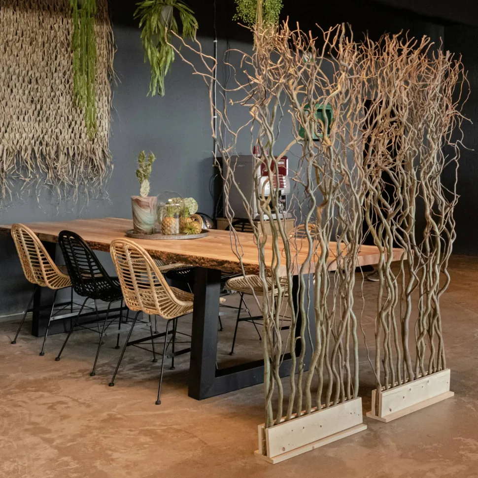 Raumteiler aus Ästen der Korkenzieherweide. Der Raumteiler hat einen stabilen Holzfuß, damit er frei im Raum stehen kann. Die Höhe beträgt 165 cm und die Breite 60 cm (die Abbildung zeigt 2 Raumteiler nebeneinander).