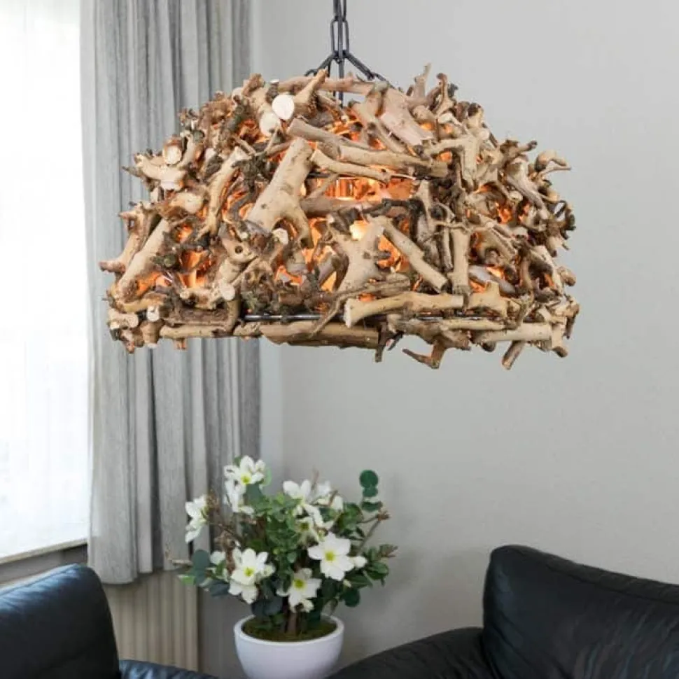 Hängeleuchte mit halbschaligem Lampenschirm, befestigt an einem runden Stahlrahmen mit einer Lampenfassung und verkleidet mit entrindeten Birnenzweigen. Die Hängeleuchte ist an einer schwarzen Kette (50 cm lang) befestigt und mit einer Deckenbefestigung versehen. Der Durchmesser der Lampe beträgt ca. 70 cm. Lieferung exklusive Glühbirnen.