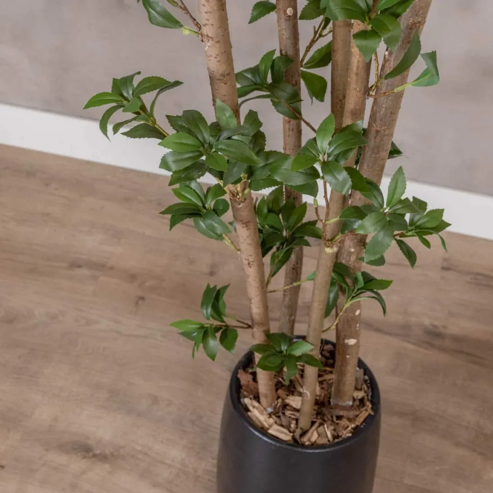 Natürliche Stämme mit künstlichem Ficus-Blatt inklusive hübschem Steintopf. Höhe 160 cm.