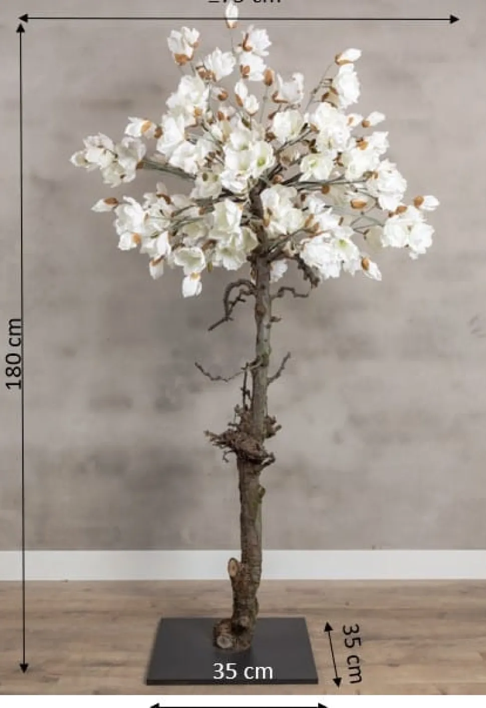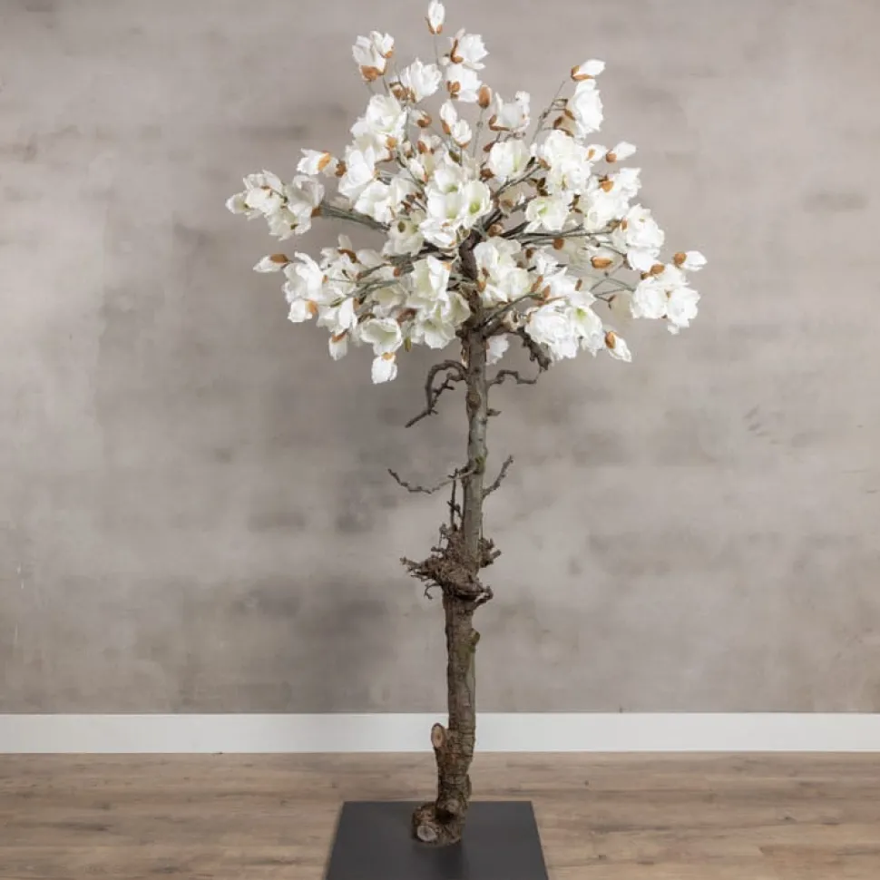 Magnolienbaum mit natürlichem Stamm und weißen Seidenblüten auf einem schwarzen Holzsockel. Höhe 180 cm.