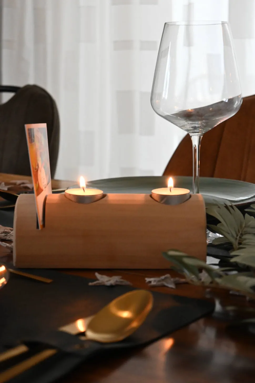 Trendiger Menükartenhalter aus Holz mit einer Aussparung für einen Salz- und Pfefferstreuer. Auch schön mit ein paar Teelichtern.