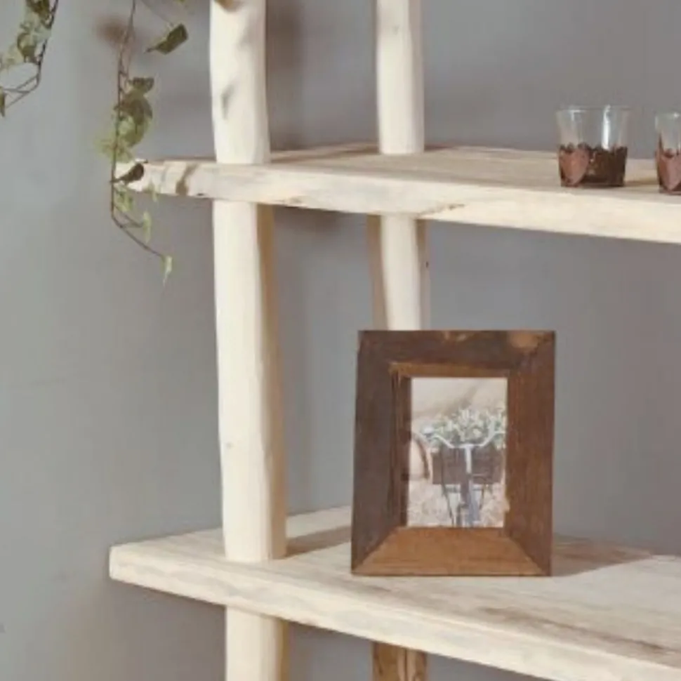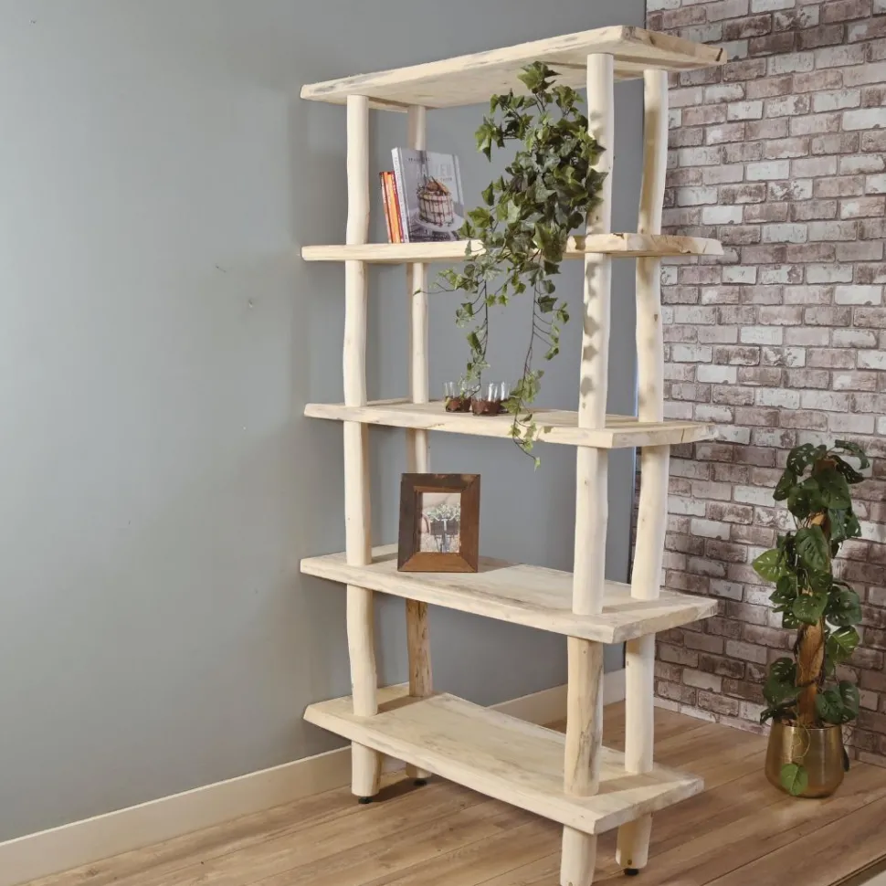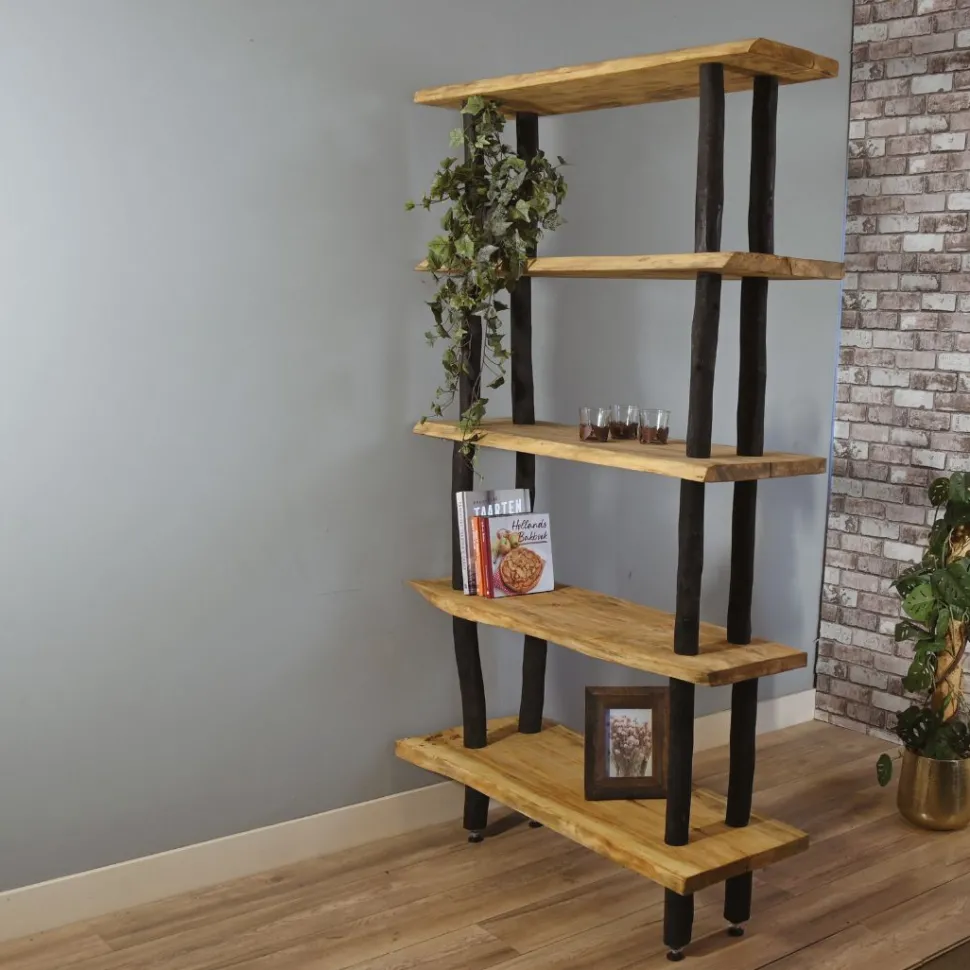 Charaktervolles Raumteiler-Regal aus echten Baumstämmen und fünf robusten Regalböden aus Eichenholz. Das Regal ist 205 cm hoch.