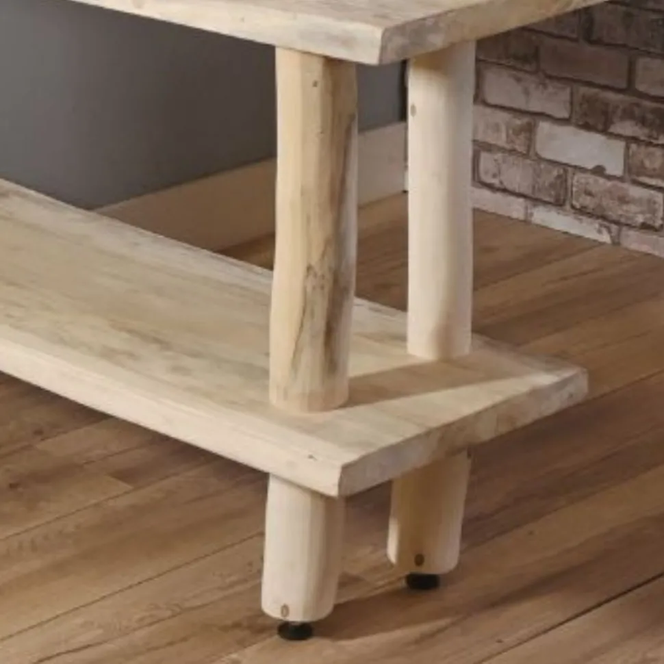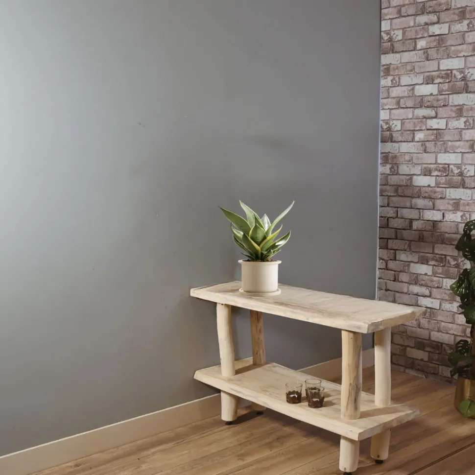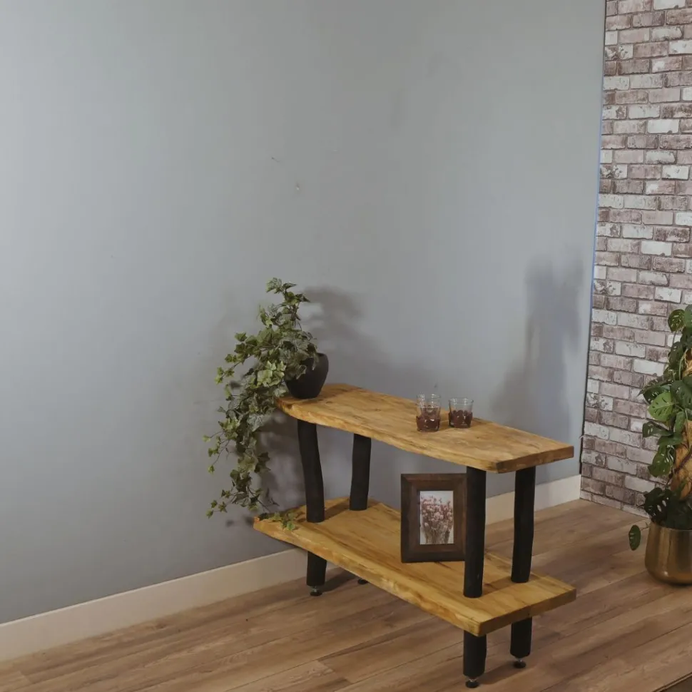 Charaktervolles Raumteiler-Regal aus echten Baumstämmen und zwei robusten Regalböden aus Eichenholz. Das Regal ist 70 cm hoch.