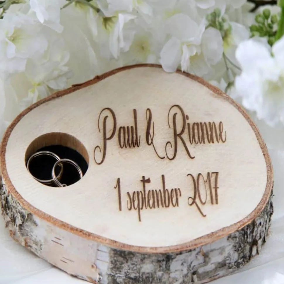 Mit Namen und Datum personalisiertes Tablett aus Birkenholz für Eheringe, Durchmesser ±20cm.