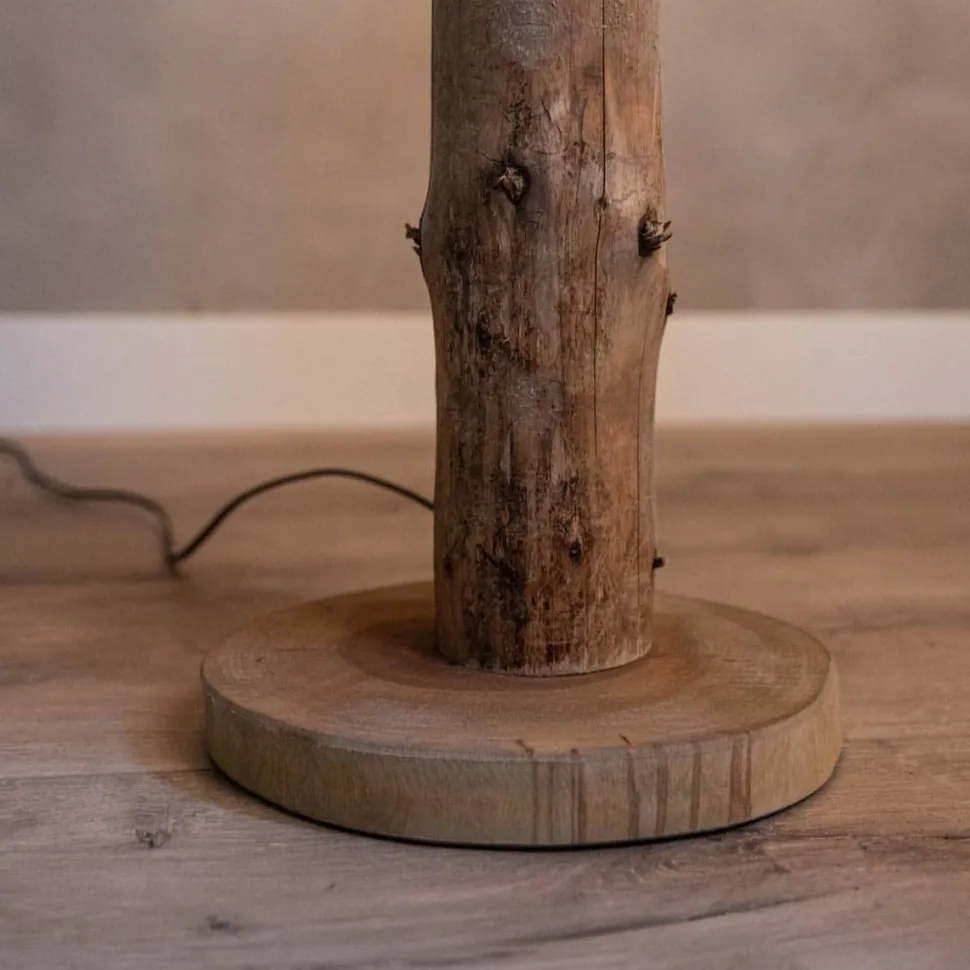 Tischlampe aus einem wunderschönen alten Eichenstamm mit einem Fuß aus einer Hartholzscheibe. Diese einzigartige, handgefertigte Lampe verleiht Ihrem Raum eine natürliche und gemütliche Ausstrahlung.