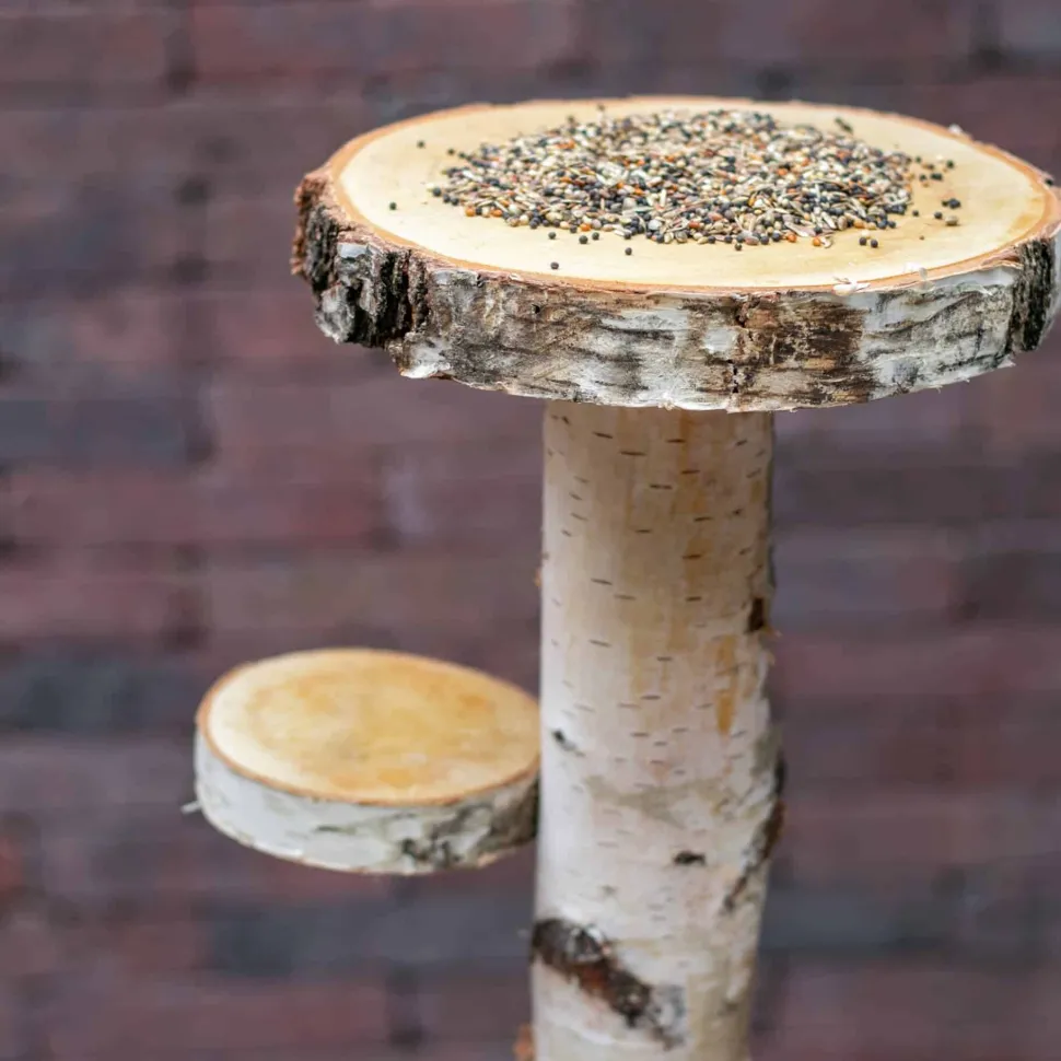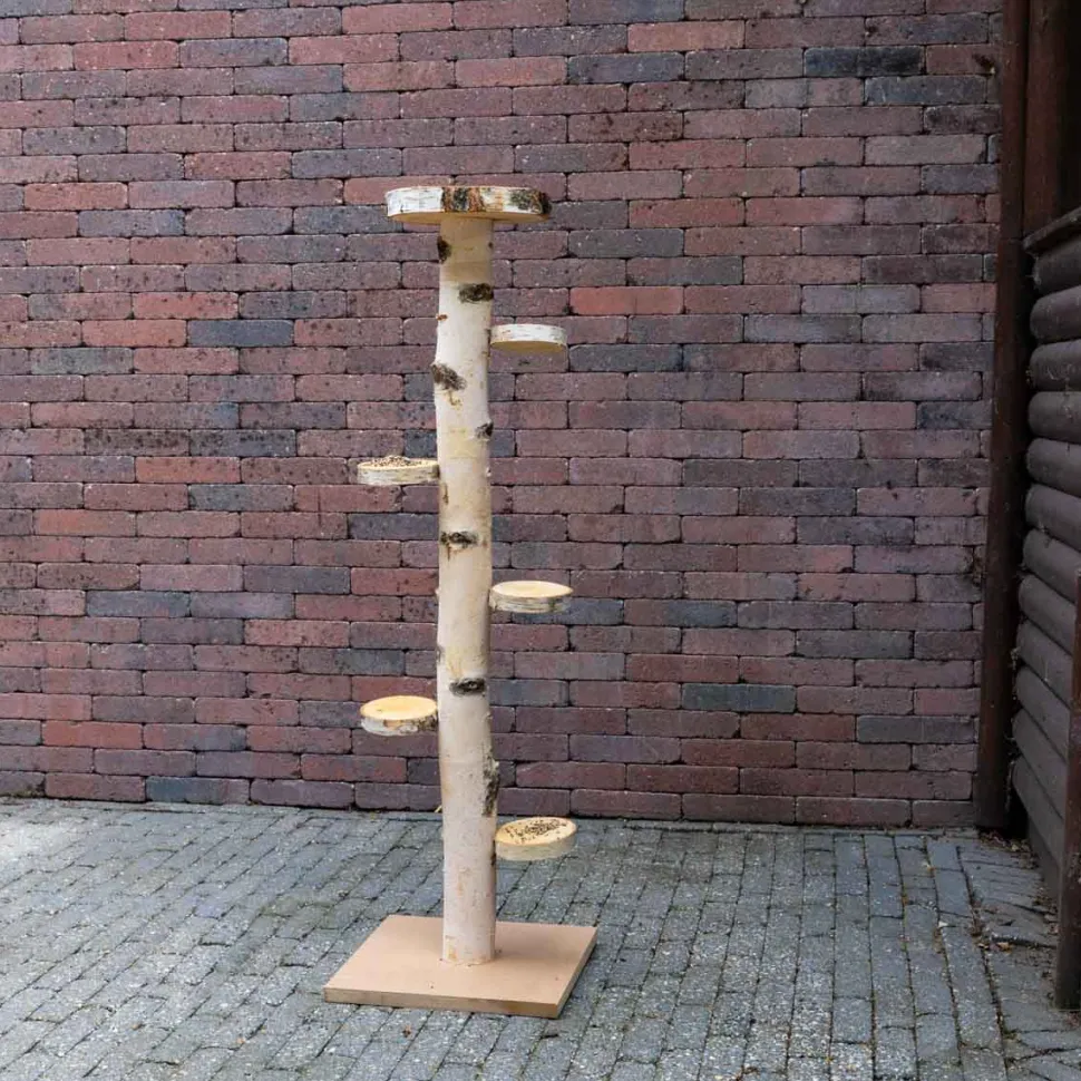 Vogel-Kletterbaum aus einem Birkenstamm mit sechs Sitzen aus Birkenholz. Höhe 100 cm, Breite ± 35 cm, Holzfuß 30×30 cm.