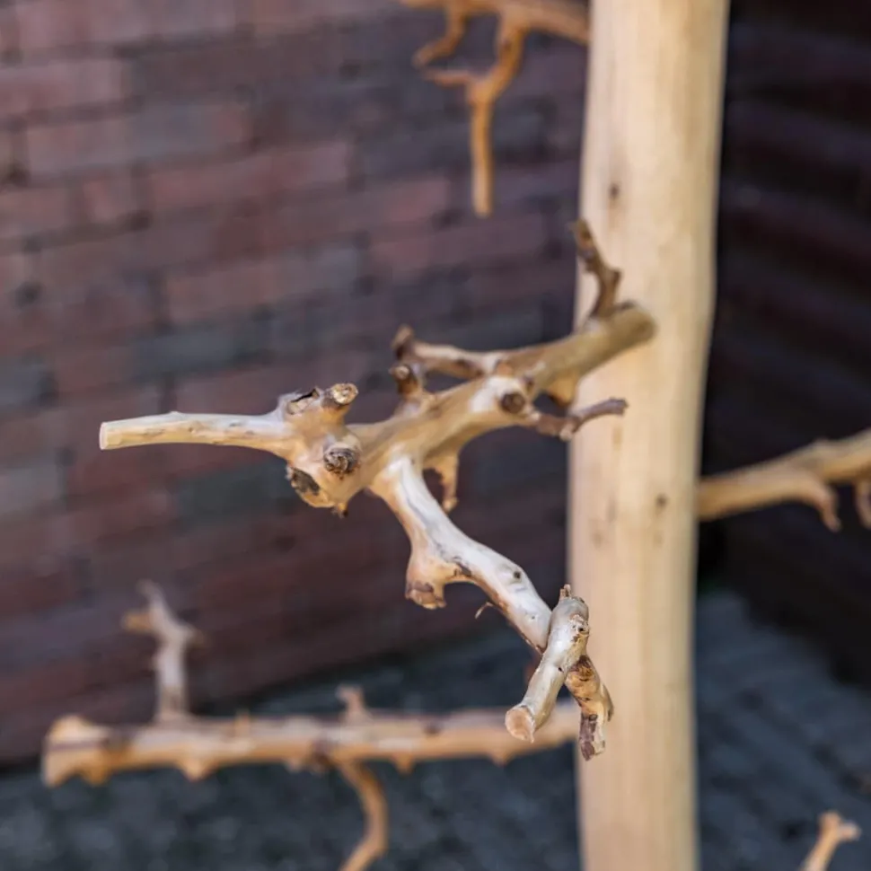Vogel-Kletterbaum aus einem entrindeten Baumstamm mit sandgestrahlten Birnbaumästen und einem Sitz aus Birkenholz. Höhe 100 cm, Breite 35 cm, Holzfuß 30 cm.