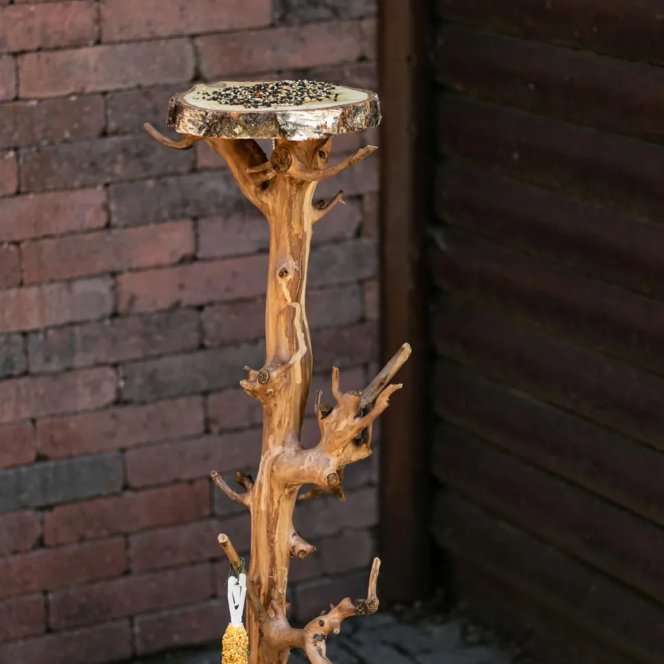 Vogel-Kletterbaum aus einem sandgestrahlten Birnenstamm mit Seitenästen sowie einem Sitz aus Birkenholz. Höhe 120 cm, Holzfuß 30 x 30 cm.