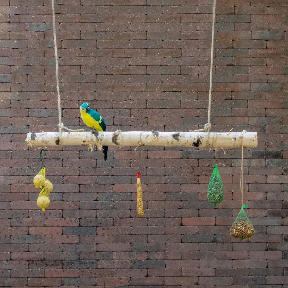 Vogelschaukel aus einem Birkenstamm mit zwei Juteseilen zum Aufhängen. Der neue Lieblingsplatz Ihres Vogels! Breite 150 cm.
